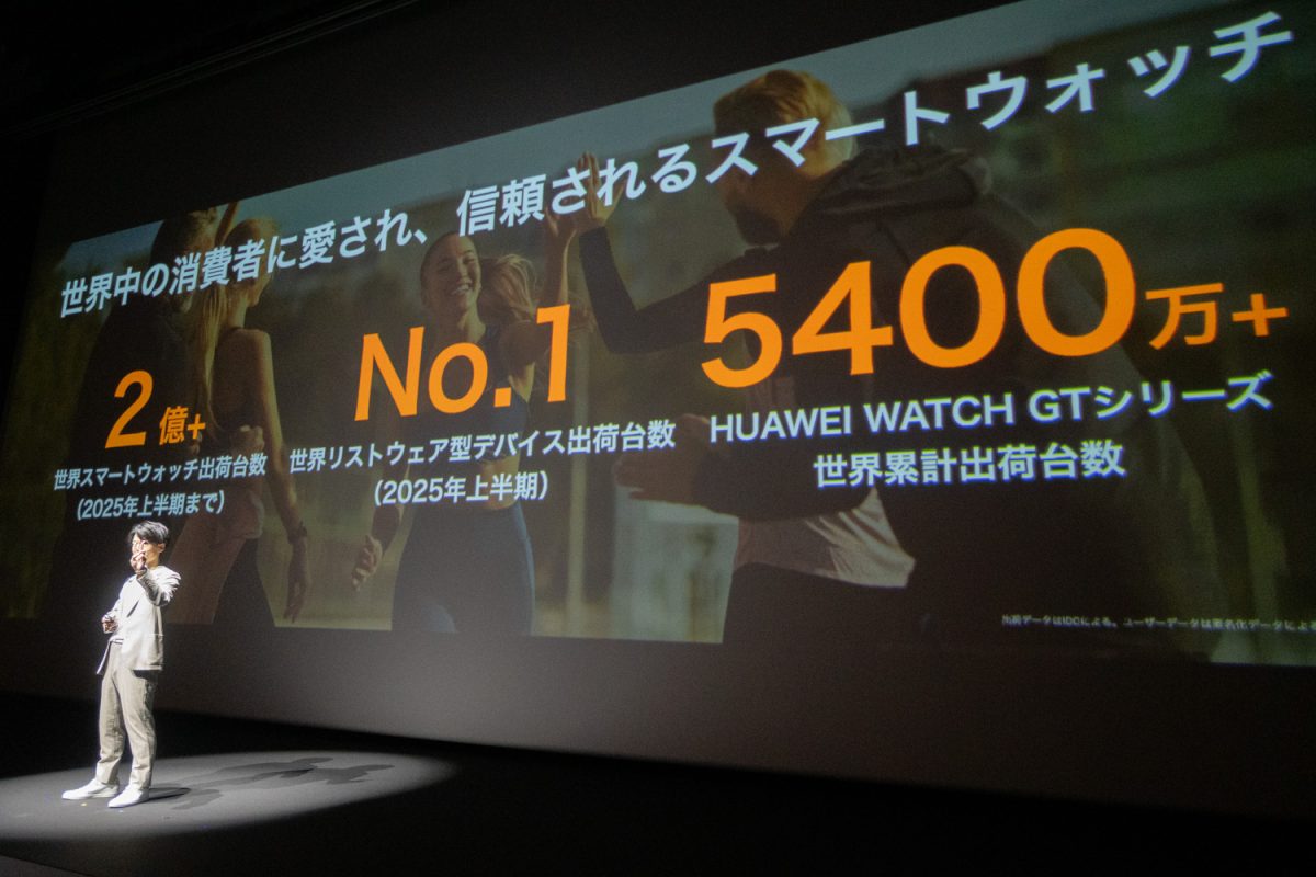 発表会では、ファーウェイデバイスジャパン プロダクトマネージャーの窪田洸氏が登壇。2025年上半期には同社スマートウォッチが世界累計2億台を突破し、スマートウォッチの出荷台数で世界1位を達成したことを説明した。またその中で、HUAWEI WATCH GTシリーズは5400万台以上の出荷実績があるという。