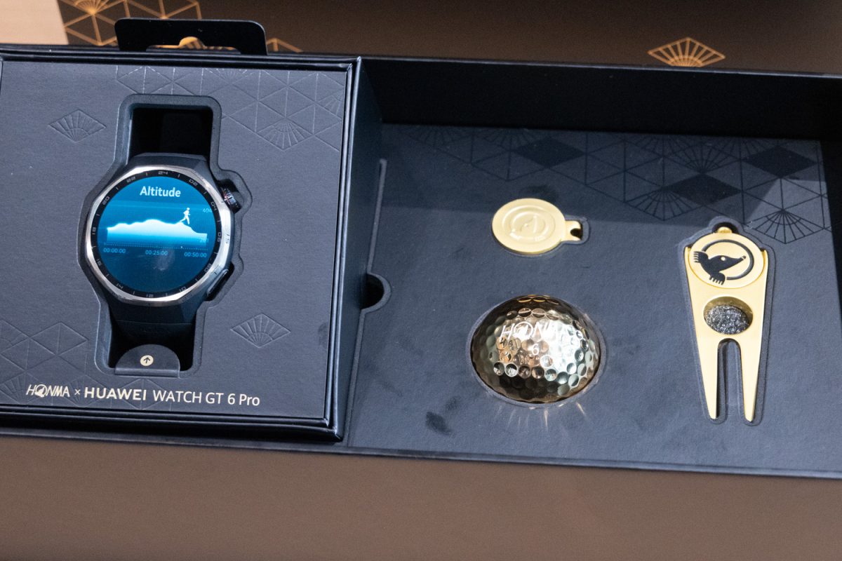 HONMAモデルは、ゴルフ総合メーカーである本間ゴルフとコラボしたもの。上述の通りHUAWEI WATCH GT6 Proがベースとなっており、ハードウェア的なスペックは同様となっている。また本体の箱は専用仕様のギフトボックスに収められており、オリジナルのゴルフボールとゴルフマーカー、グリーンフォークが付属する。