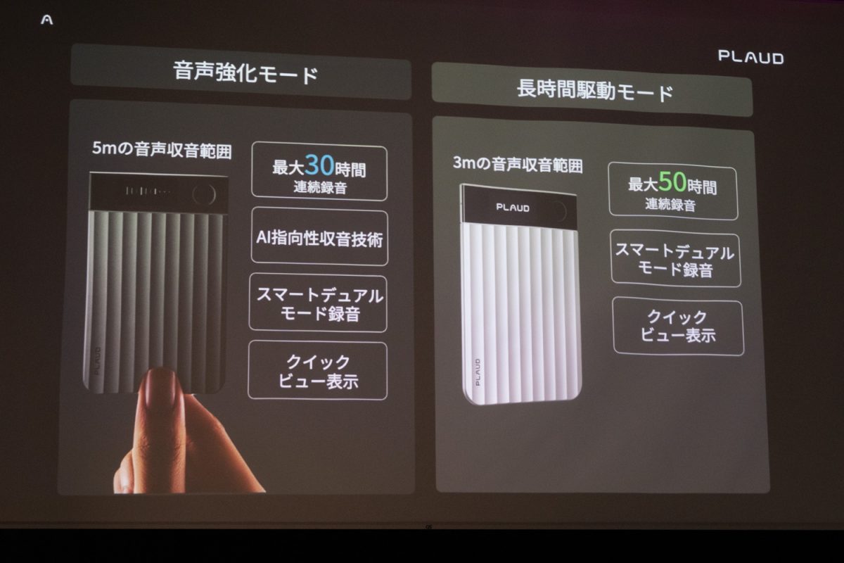 なお、5mまでの収音とAI指向性収音技術を利用できるのは「音声強化モード」にした際で、この場合の連続駆動は最大30時間。「長時間駆動モード」を利用することで、収音範囲はPlaud NoteやPlaud Note Pinと同じ3mに縮小されるものの、最大50時間駆動させることができる。