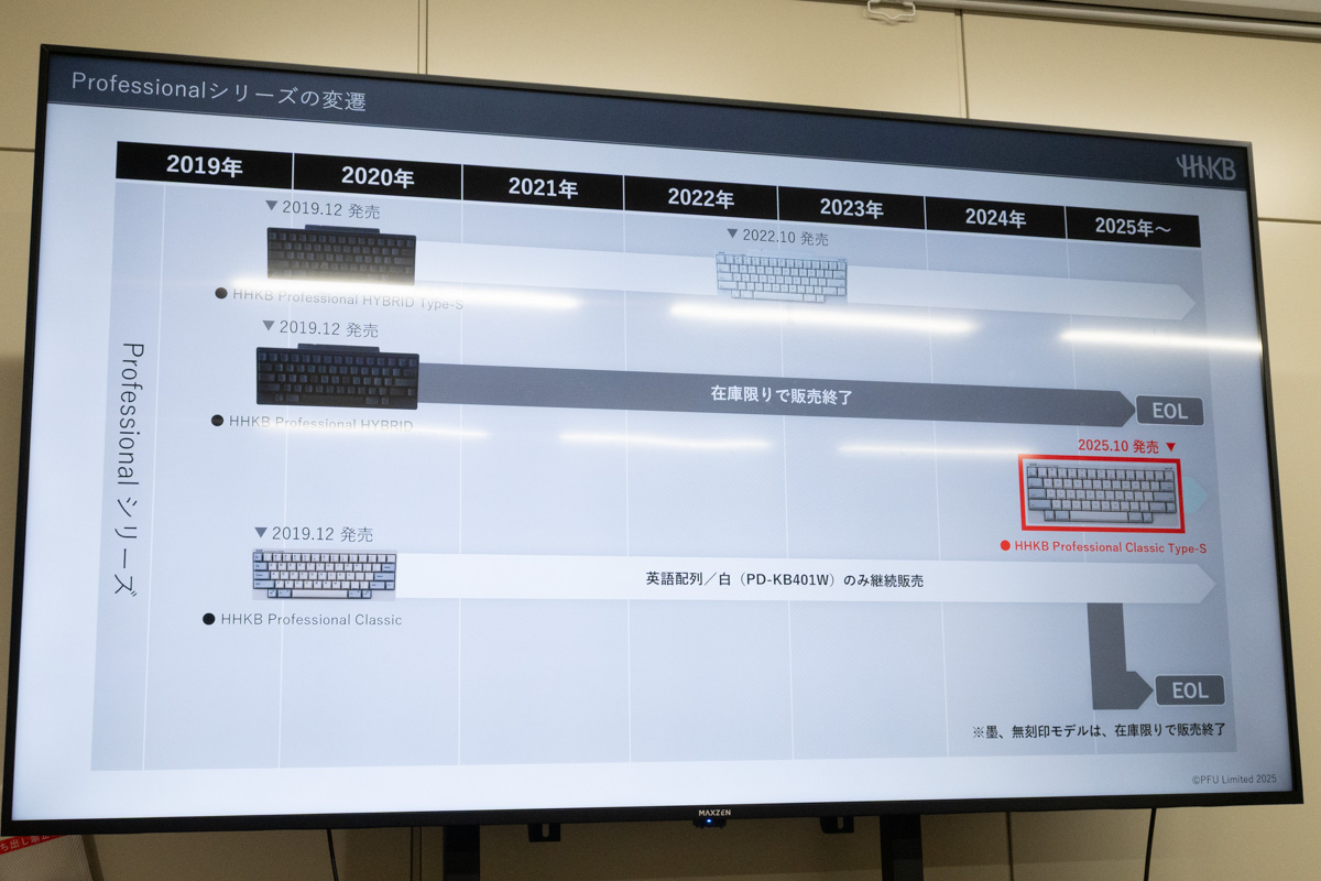 2019年12月以来のProfessionalシリーズのラインナップ刷新。本モデルの発売に合わせて、最上位のワイヤレス対応モデル「HYBRID Type-S」、廉価版の有線モデル「Classic Type-S」、英語配列/白・刻印モデル/有線のみのレジェンダリーモデル「Classic」という構成となる。廉価のワイヤレス対応モデル「HYBRID」および、Classicの墨/無刻印モデルは在庫限りで販売終了する。