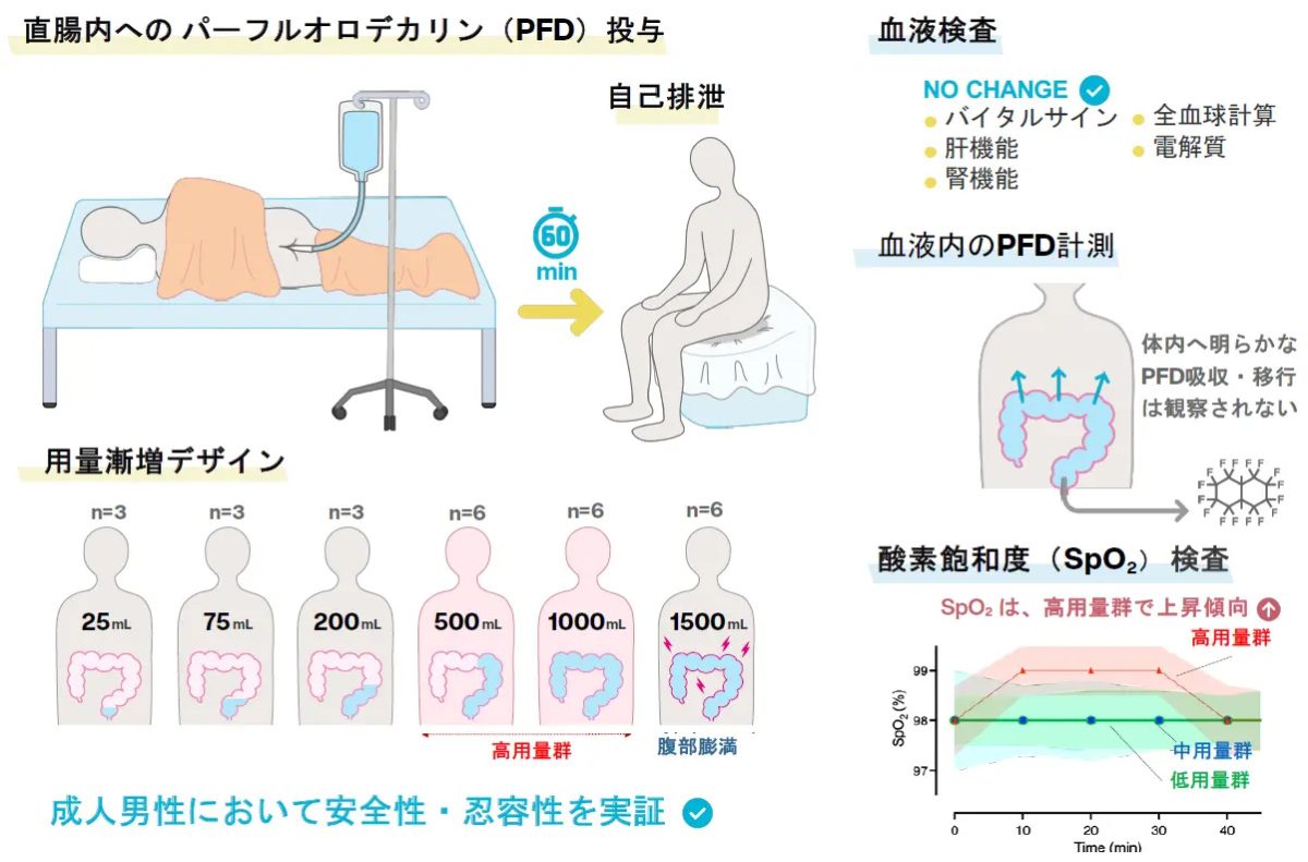 今回新たに発表された論文は、受賞した研究をさらに実用化に向けて推し進めるため、世界で初めて人間に対してPFDを肛門から投与した。
