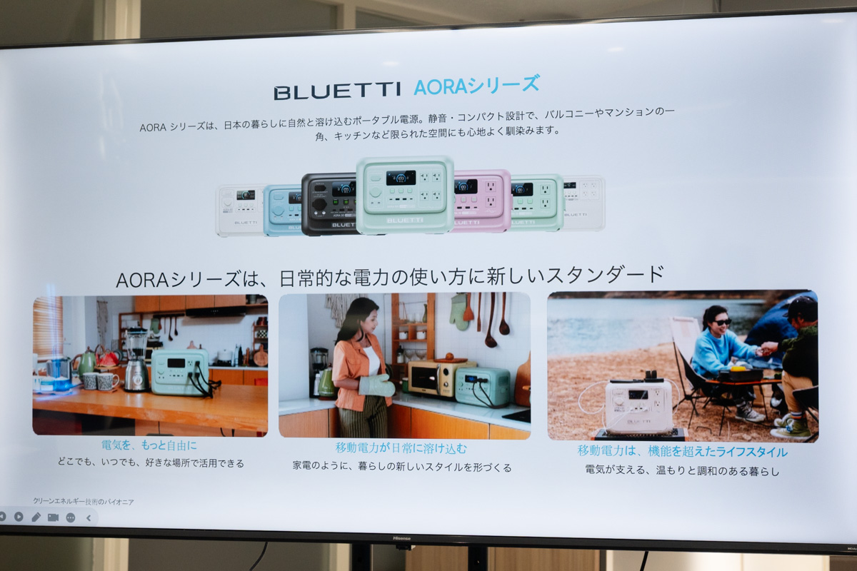 今回発売した新製品は、AORA(アオラ)シリーズに位置している。同シリーズは日本市場に向けたモデルで、ネーミングは “青い空” に由来しているとのこと。「普段の生活にポータブル電源を使ってほしい」という思いから、コンパクトでカラーリングにもこだわり、ディスプレイ表示も日本語を使うようにしている。サポートセンターも国内に設けている。