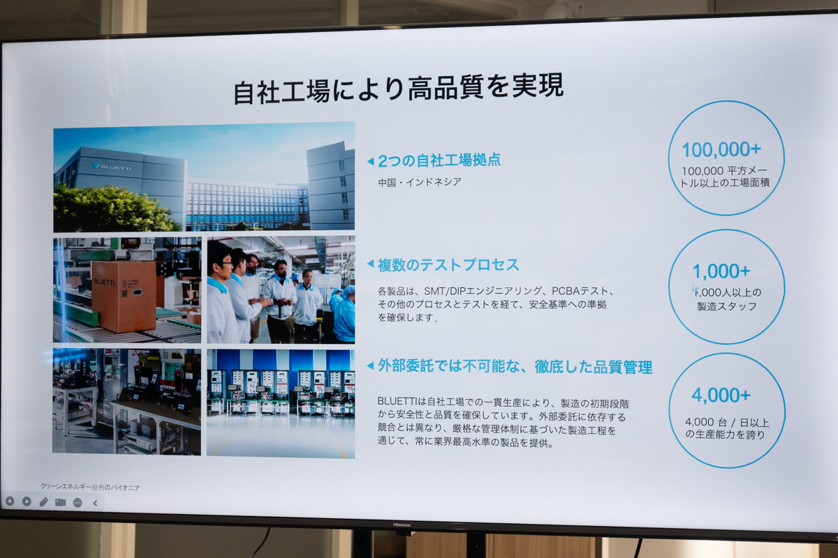 自社工場を持っていることは上述したが、これによって委託ではできない品質追求を行っているという。川村氏は「すべての工程を自社でやっているのはBLUETTIだけだと思う」と話しており、研究開発から製造、テストまで一貫して担っている。自社設備で国際基準を超える水準のテストを行うことで、品質と安全性は「世界のポータブル電源のメーカーでもトップクラス」だと川村氏は述べた。