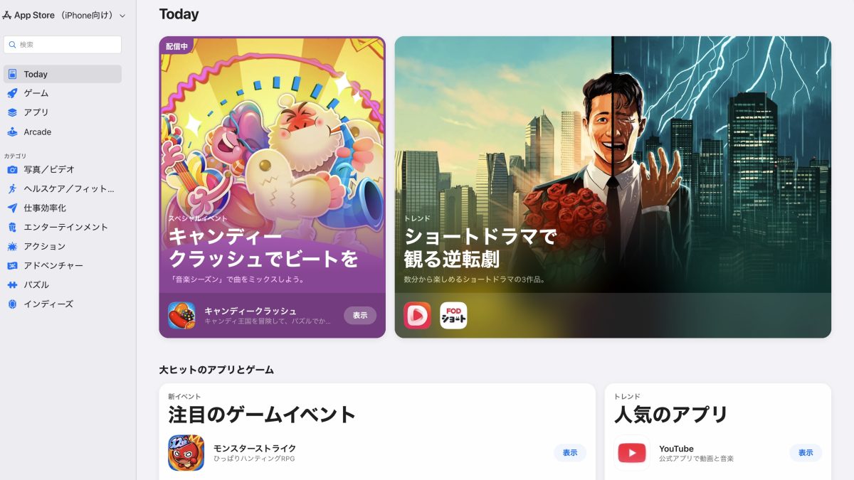新しいウェブ版App Storeには、iPhoneでおなじみの「Today」タブが再現されており、スペシャルイベント、トップチャート、編集チームによる特集などに簡単にアクセスできる。