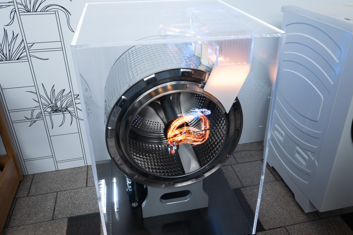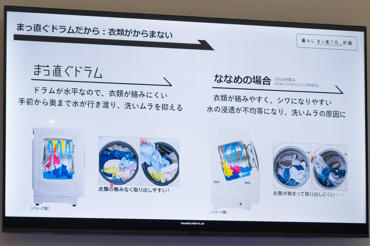 まっ直ぐドラムは、ドラムをななめではなく水平に配置することで、コンパクトと大容量を追求したシリーズ。水平なドラムによって均一に衣類が回転することで、衣類の絡まりや洗いムラも抑さえられるとする。