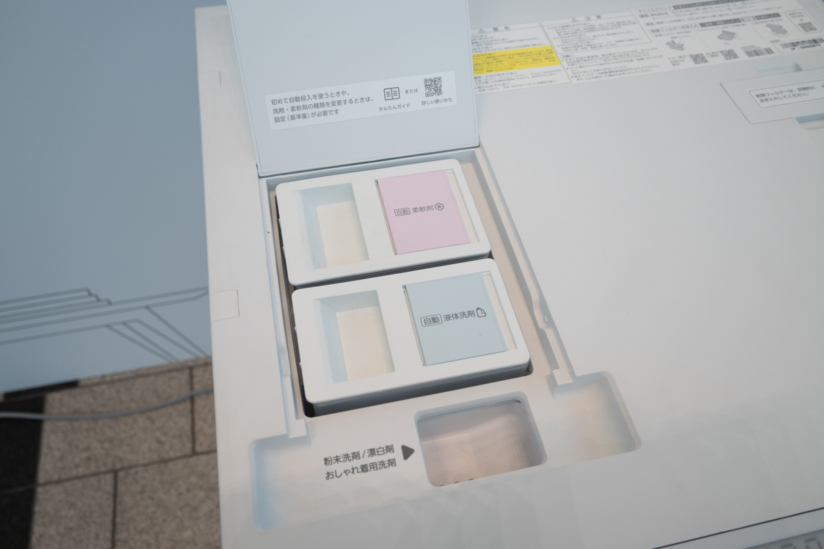 液体洗剤と柔軟剤の自動投入に対応する。タンクは洗剤と柔軟剤をそれぞれ独立させることで、個別に取り出せるようになった。
