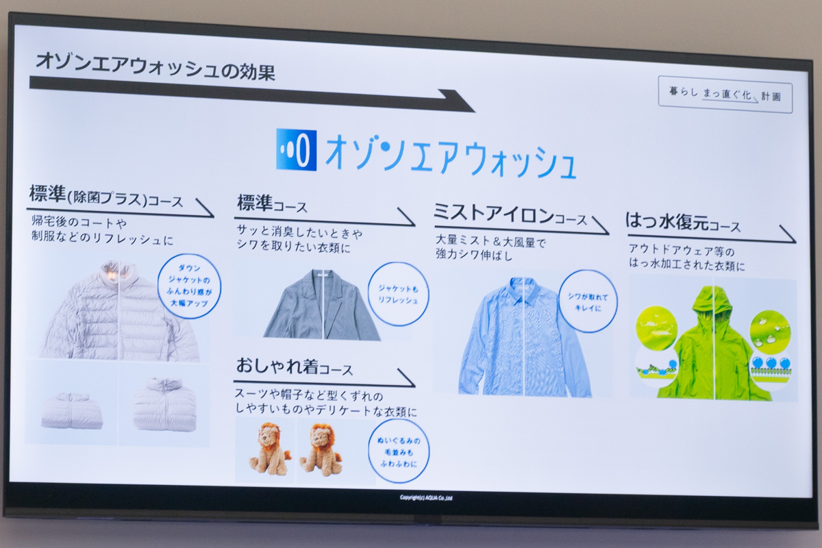 新機能として、衣類を水洗いせずに除菌・消臭する「オゾンエアウォッシュ」を搭載。オゾンと温風ミストで清潔にすることによって、ウイルスと花粉の抑制も実現したという。衣類をリフレッシュするだけでなく、ワイシャツのシワを伸ばすミストアイロンコース、アウトドアウェア等に使えるはっ水復元コースといったコースも用意する。