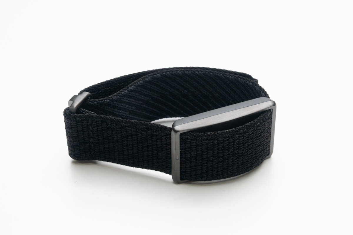 本体の質量は30gの軽量設計で、就寝時にも使えるような心地よい着用感を追求。ベルトは布製で、面ファスナーによってサイズを調整可能。2サイズのベルトが付属する。