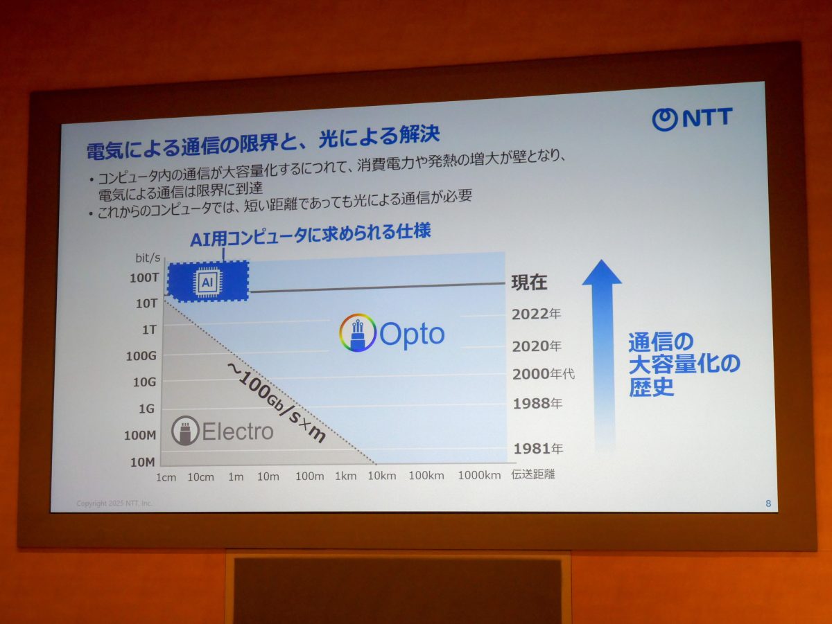 実際IOWNでも、その基幹技術となる、電子を可能な限り光に置き換える「光電融合」を、ネットワークだけでなくコンピュータの中に取り入れようとしている。ネットワークの大幅な低遅延を実現した「IOWN 1.0」までは通信に関する取り組みが主だったが、2026年度からの商用提供が見込まれている「IOWN 2.0」では、コンピュータのボード間接続に光電融合技術を用いており、コンピュータの内部にIOWNを取り入れようとしていることが分かる。