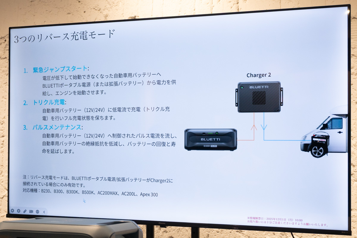 さらに、自動車の鉛バッテリーへのリバース充電をサポート。緊急時のジャンプスタートのほか、微弱な電気を流すことで適正な電圧に保てるトリクル電源、パルスの電気を送るバッテリーの寿命を伸ばせるパルスメンテナンスに対応する。なお、これらの機能を利用するには、BLUETTIの対応ポータブル電源/拡張バッテリーとの接続が必要。