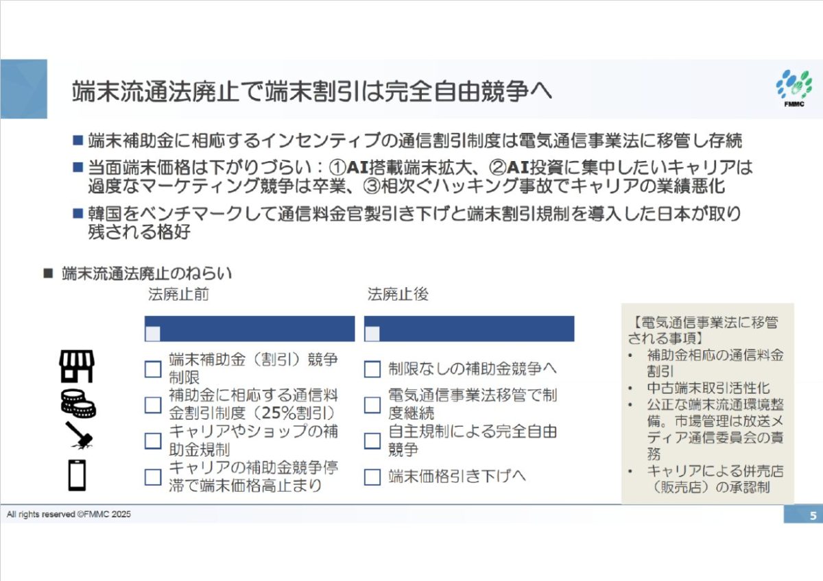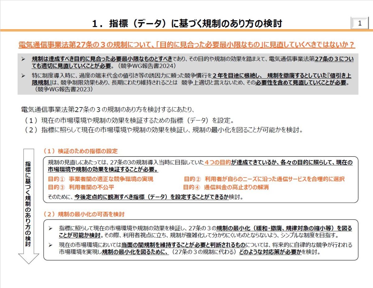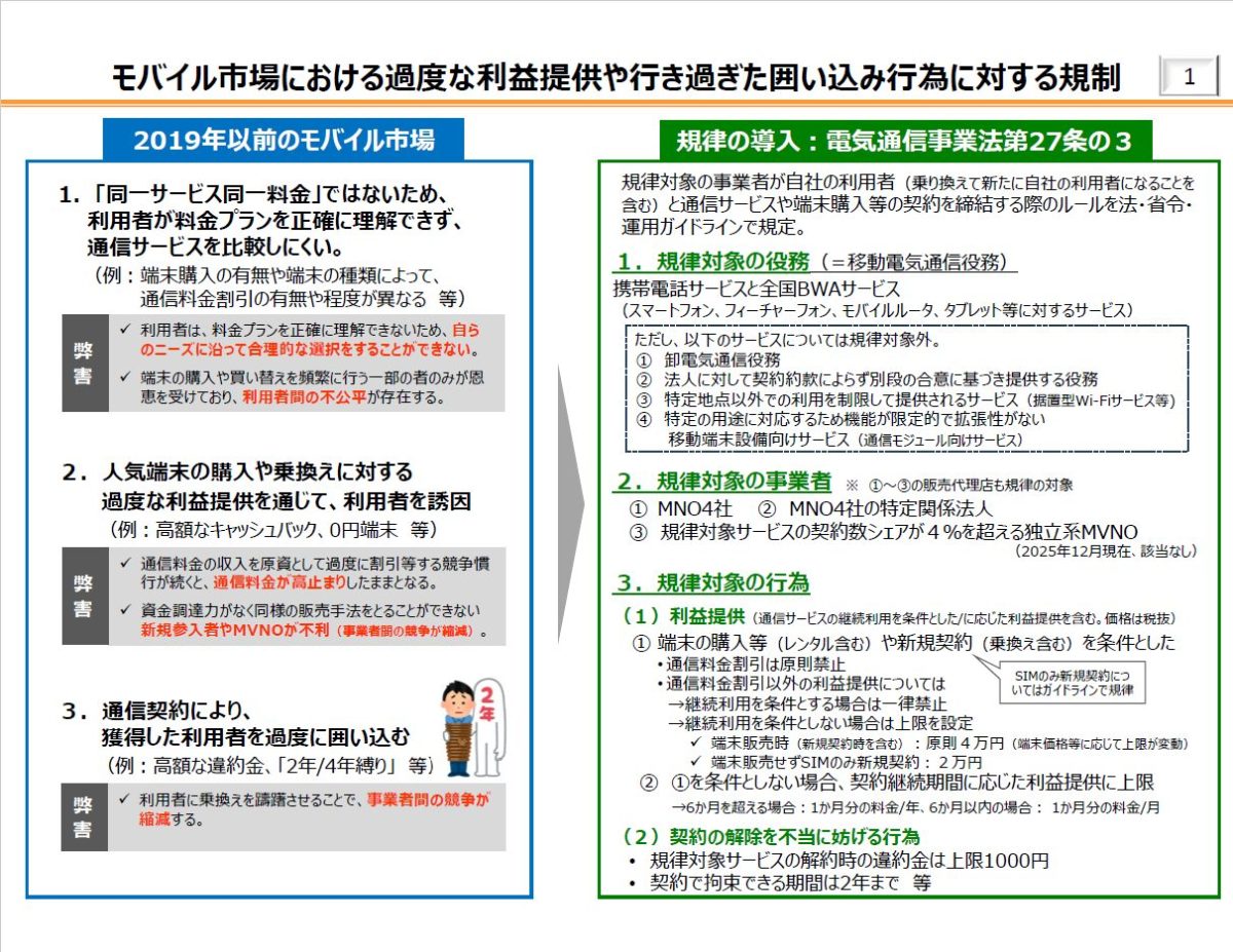 それを示しているのが、総務省が新たに設けた有識者会議「利用者視点を踏まえたモバイル市場の検証に関する専門委員会」である。その第一回の会合が2025年12月12日に実施されており、内容を確認すると「電気通信事業法第27条の3」、要は2019年に改正された電気通信事業法で追加された規制を「目的に見合った必要最小限なもの」に見直すべきでは、という所から議論を始めようとしていることが分かる。