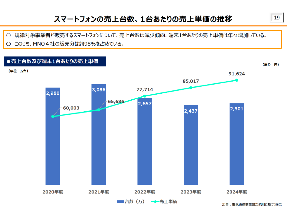 その結果、市場にどのような変化がもたらされたのか。1つは円安が急速に進んだ2022年以降、スマートフォンの価格が大幅に高騰して販売台数が大きく減少したことだ。携帯電話会社の側で値引きをして購入しやすくしようとしても、法律で規制されてしまっているのだから当然の結果といえる。