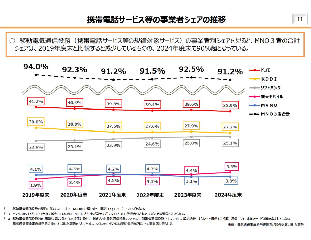 一方で法改正は、国ひいては監督官庁である総務省が実現しようとした競争促進に、決して繋がっていないことも明確に示されている。最近では新興の楽天モバイルが契約数を伸ばすなどやや変化は見られるものの、大手3社とそのグループによるシェアが9割を超えている状況は、法改正前と大きく変わっていないのが実情だ。