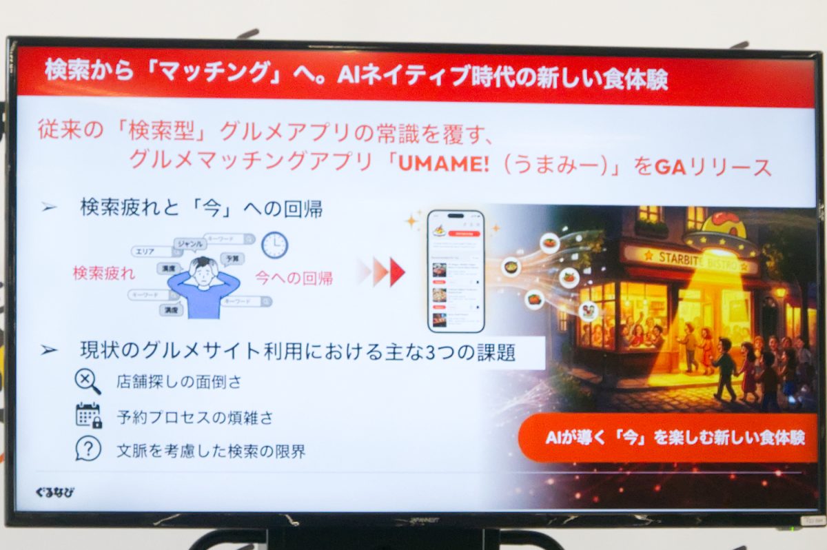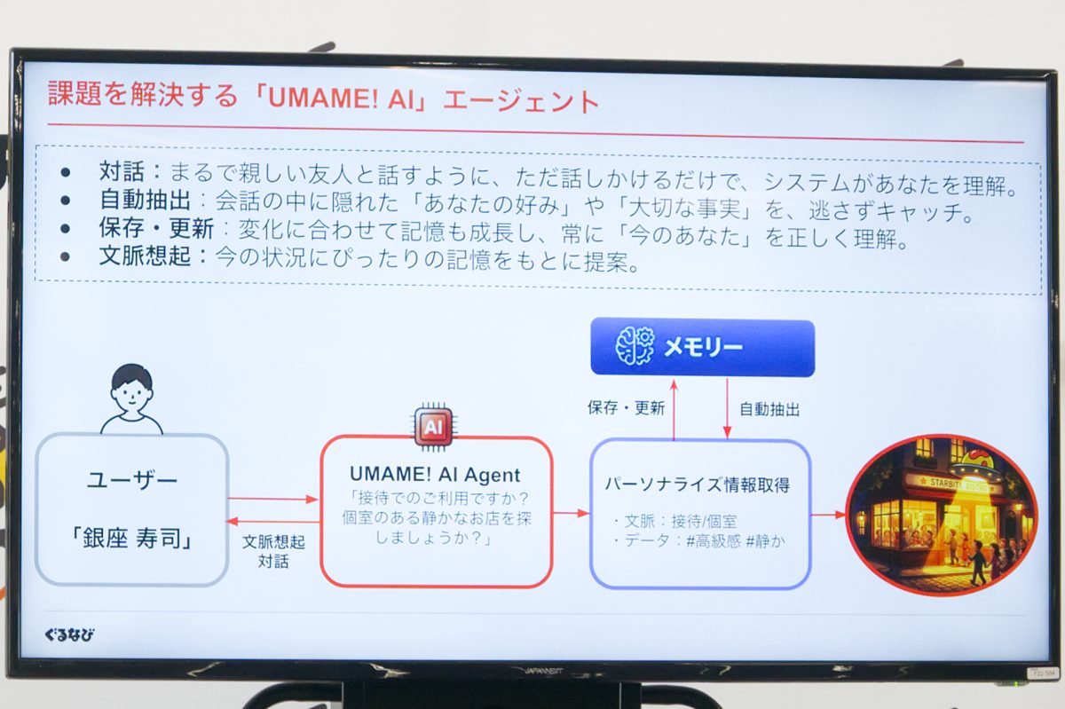 ぐるなびは、AIエージェント搭載アプリ「UMAME!(うまみー!)」を1月20日に正式ローンチした。