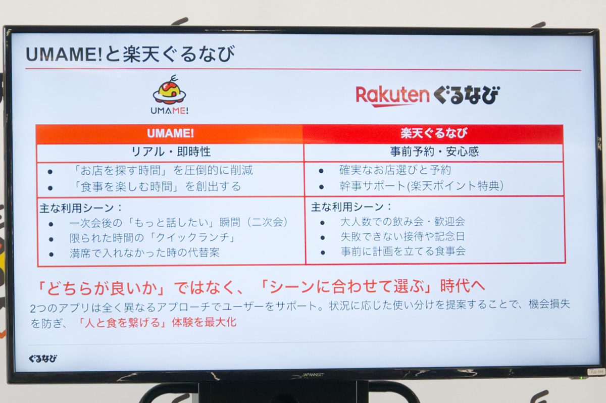 なお同社は別アプリ「楽天ぐるなび」も提供しているが、こちらは確実に店選びと予約ができることから、事前に計画を立てる食事会や大人数での飲み会に適しているとのこと。UMAME!は、一次会の後に二次会に行くシーン、満室で入れなかったときの代替案など「どこに行ったら良いかわからない」場合を想定しているという。岩本氏は「シーンに合わせて選ぶ時代」であると話し、「2つのアプリを全く異なるアプローチでの提案を目指していく」とした。