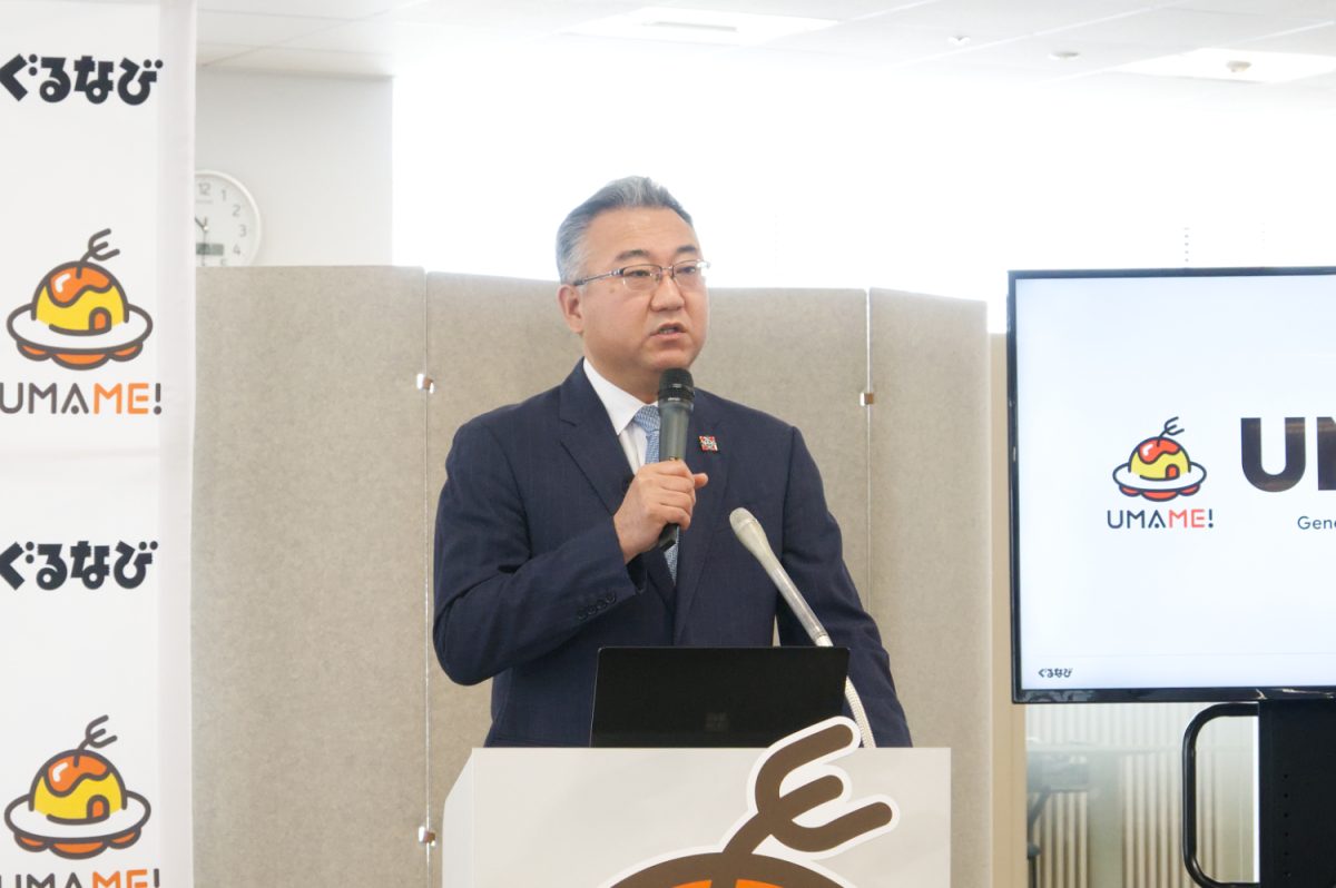 発表会の冒頭には、代表取締役社長 杉原章郎氏が登壇。UMAME!が「1年間のぐるなびの進化を代表するサービス」だと話し、「ユーザーひとりひとりの食に関わるパーソナライズ情報を深く理解するAIエージェントに進化しつつある」とアピールした。