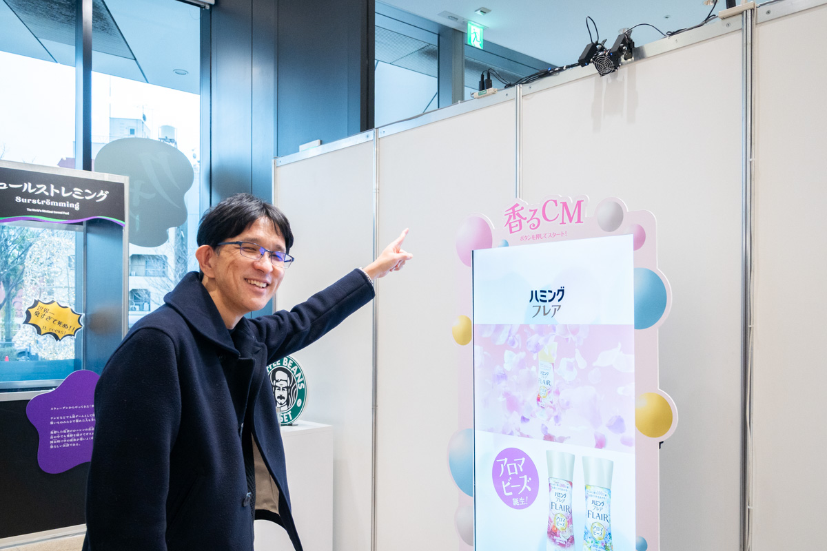 ソニーのGrid Scentによる “においの体験” に呼応した花王が、同社の柔軟剤商品による香りの魅力を届ける店頭設置用什器をソニーと試作した。今回のイベントでは花王の協力により、試作什器を使った同社商品の動画広告を事例として展示している。