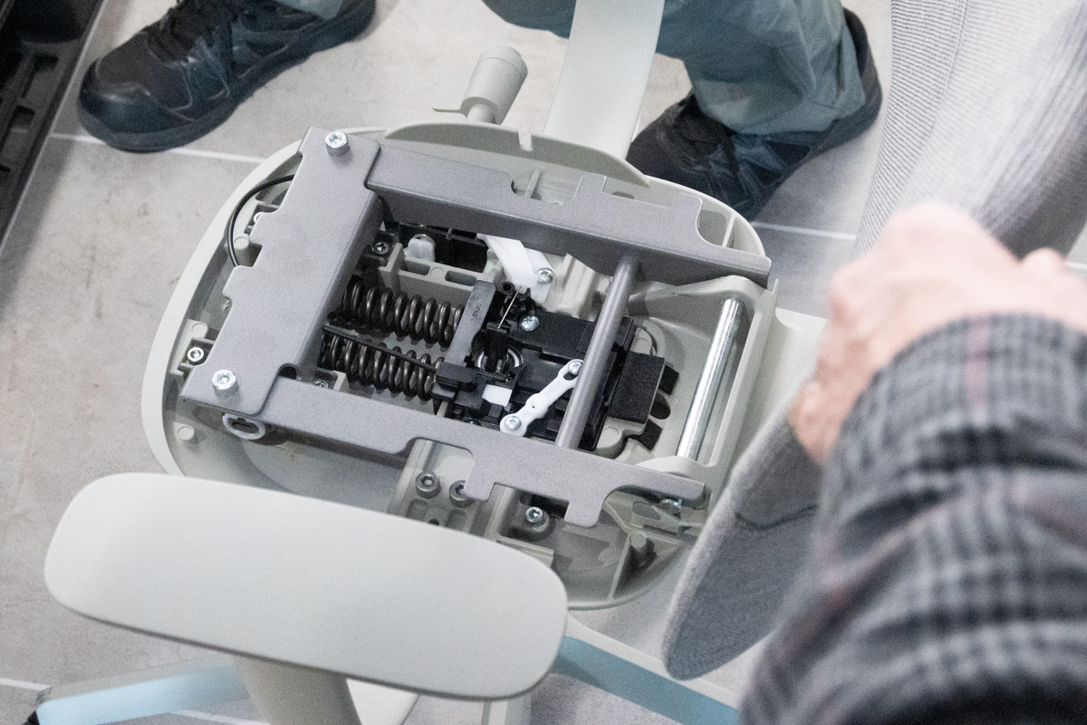 デザイン上の最大のハードルは、柴田氏が求めていた「座面の下のメカの部分を極限まで薄くすること」の実現だ。メカとは機能を実現する内部構造のこと。これを実現するために新規メカを開発したが、背もたれと座面が一緒に動くシンクロロッキングのものは、12年前の「エフチェア」以来だという。