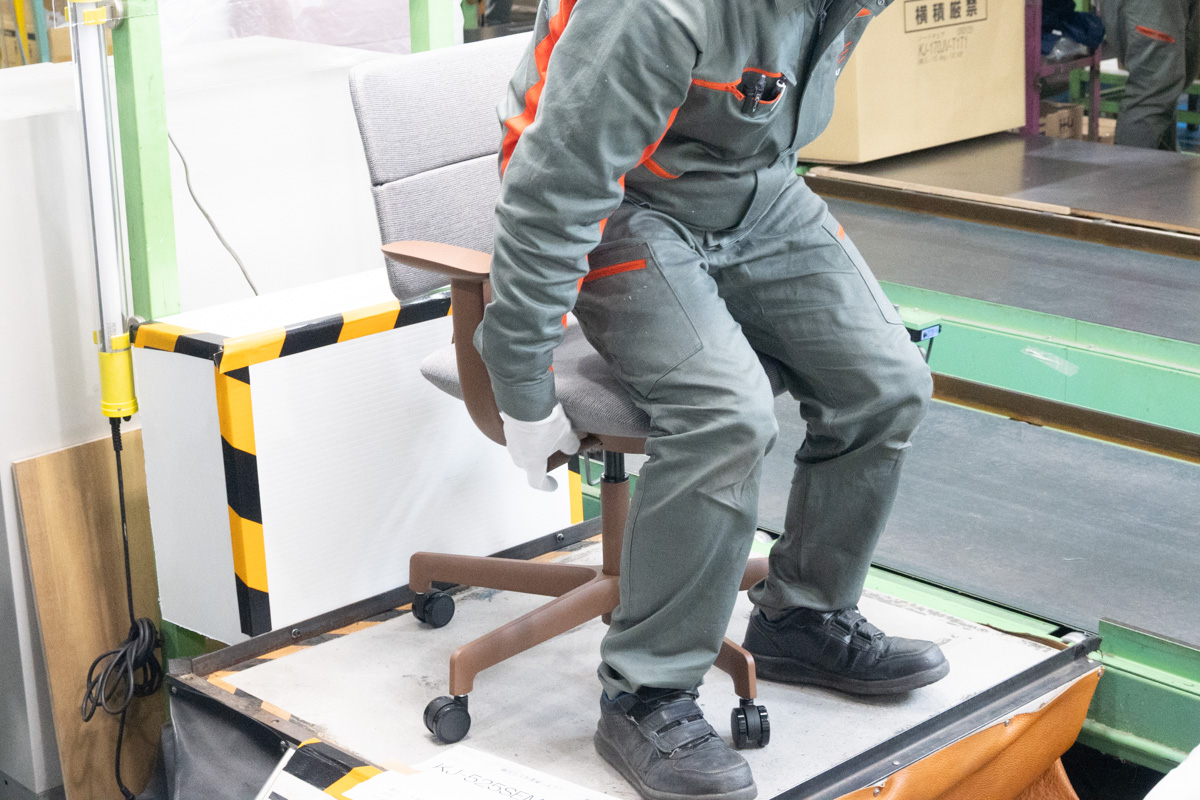 いずれも完成品は、検査員によって全数検査が行われる。傷や汚れの有無だけでなく、検査員が座って昇降やロッキングの動作、キャスターの動きを確認するなど、実際に試して動作確認を行っているそうだ。