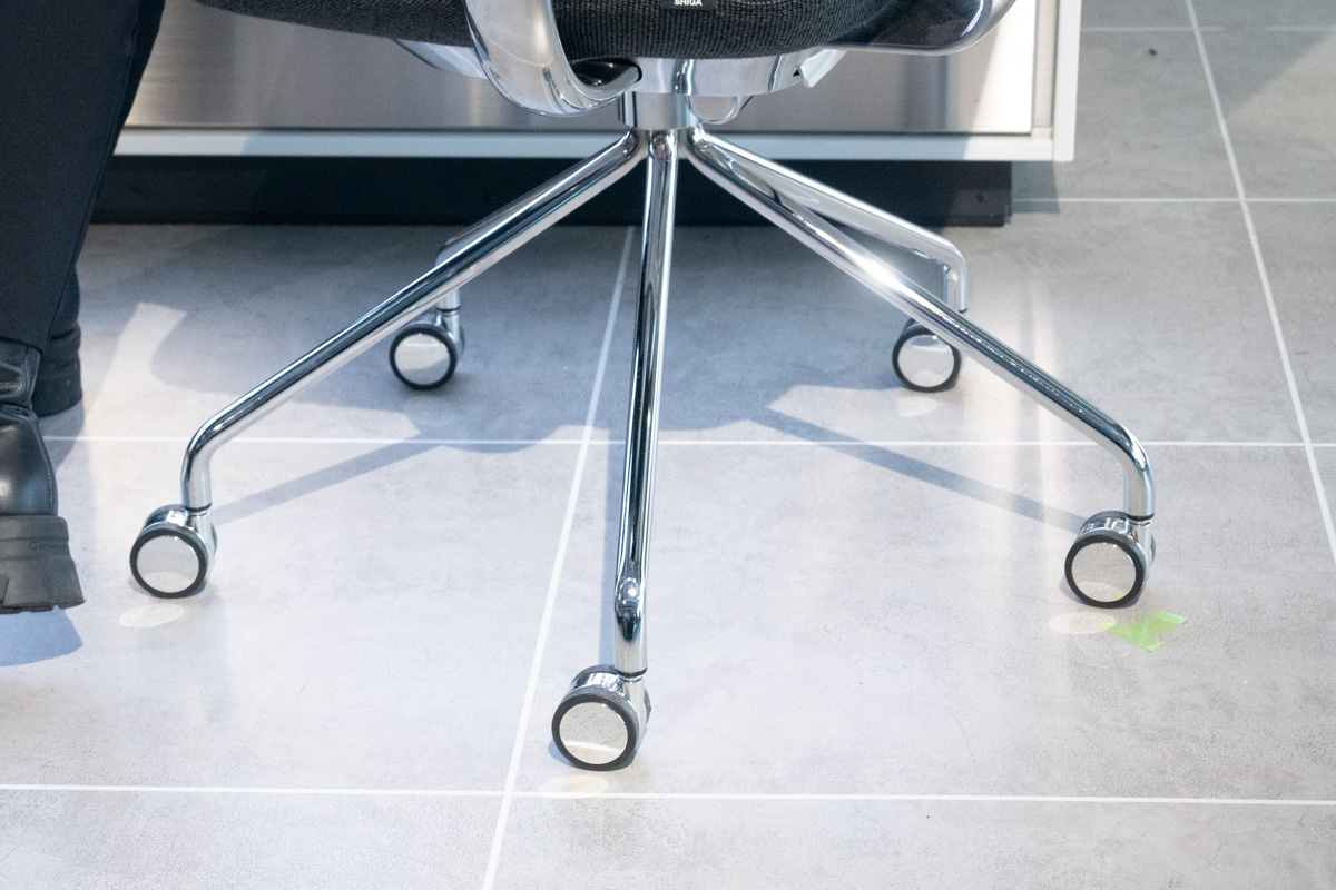 そのほか、カラーに合わせて色出しされたジョイントパーツや、本体に合わせて塗装されたガスシリンダーの軸など、細かい部分にまでこだわられている。キャスターも既製品を使わず、本体に合わせてメッキされたものも用意。アルミダイキャストの肘置きは、素材が違うと微妙に色に差が出ることから、天面までもアルミ素材で統一されている。