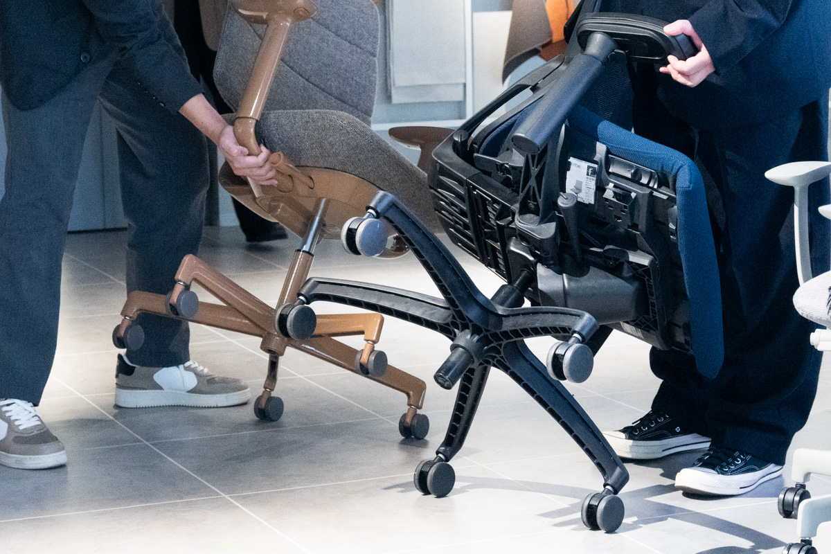 また同社は、昨年12月に新型ワークチェア「SHIGA」を販売開始。このチェアのネーミングが滋賀工場に由来していることもあり、今回はSHIGAの開発裏話の紹介、そしてSHIGAの製造現場を中心に工場見学が行われた。