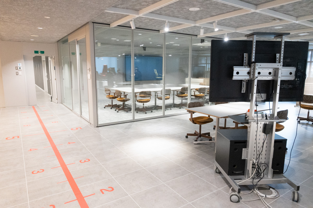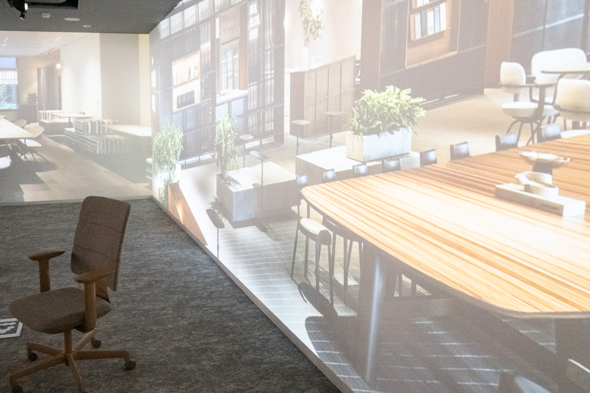 隣接するスタジオには3面に4台のプロジェクターが備えられ、仮想のオフィス空間を壁一面に投影できる。ここに実物の試作品を置くことで、実際の空間での見え方を検証したり、MRゴーグルを使って試作デザインを仮想的に表示したりできる。