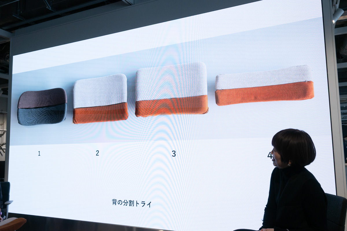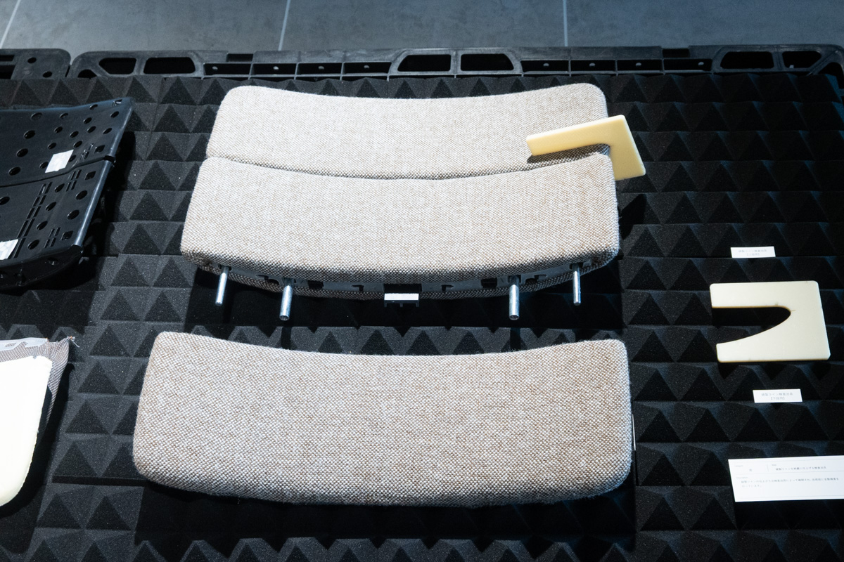 もう一つ苦労したのは、SHIGAの大きな特徴である “分割された背もたれ” だ。単に背もたれを分断したり、布地を分割させただけでは、ラインが波打って綺麗な直線が出ない。工業製品として実現させるために、試作を繰り返したそうだ。