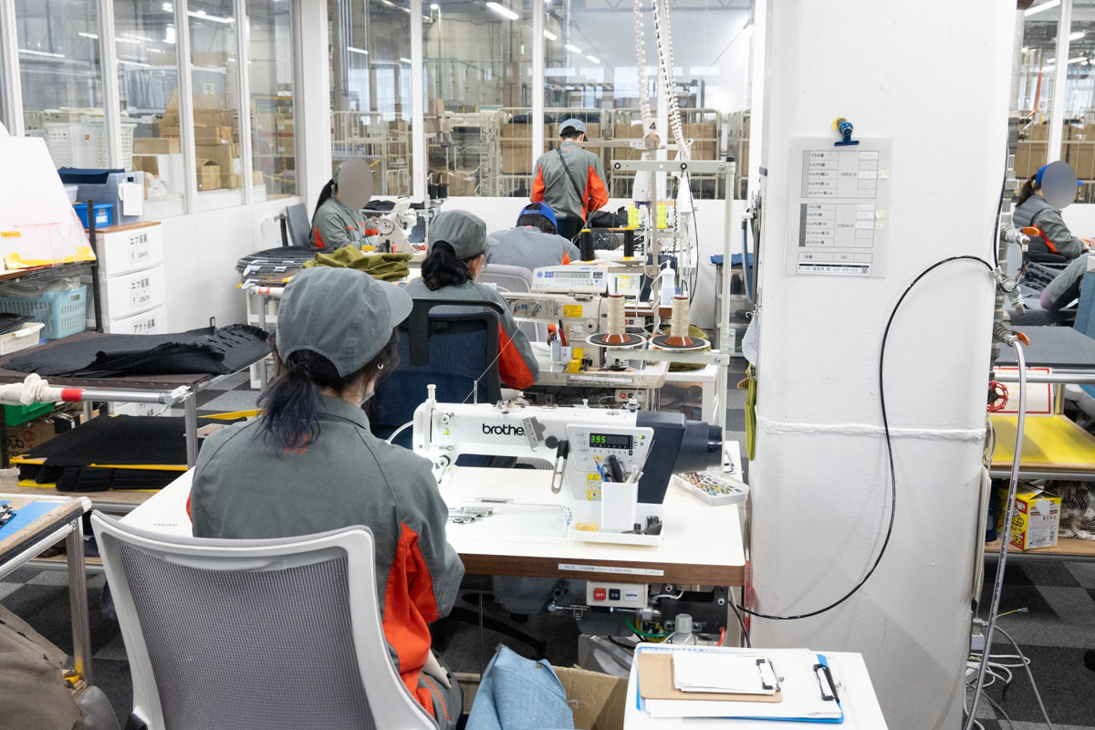 工場ではSHIGAの製造工程を見学した。まず工場5階では、生地の裁断から縫製、かぶせ(クッションに布を張る工程)までを実施。SHIGAの特徴である分割された背もたれは、縫い目のラインを段ごとにミリ単位で揃える必要があるため、かぶせの工程では、ラインの位置を手作業で確認・調整している。スクエアな形状を出すため、コーナー部分のエッジをしっかり出せるように気を配っている。