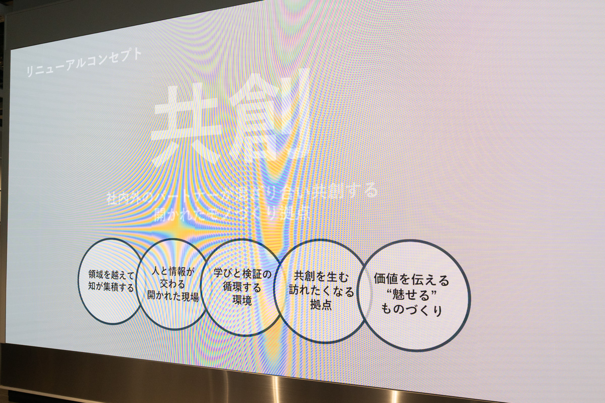 リニューアルは主に、工場に隣接する4階建てのオフィスエリアが対象。1階は「社外共創」のフロアで、モノトーンで統一された空間の床や壁にはグリッドが施されている。これらは “スケール感” を表現しており、椅子の高さが1cm違うだけで目線が変わることから、寸法感覚を意識させるための仕掛けとなっている。続く2階は「社内共創」の場として、カフェスペースやコワーキングスペース、会議室といった社内の共創エリアを設けている。隣接したエリアには、開発ラボやスタジオ、エルゴノミクスラボが用意されている。