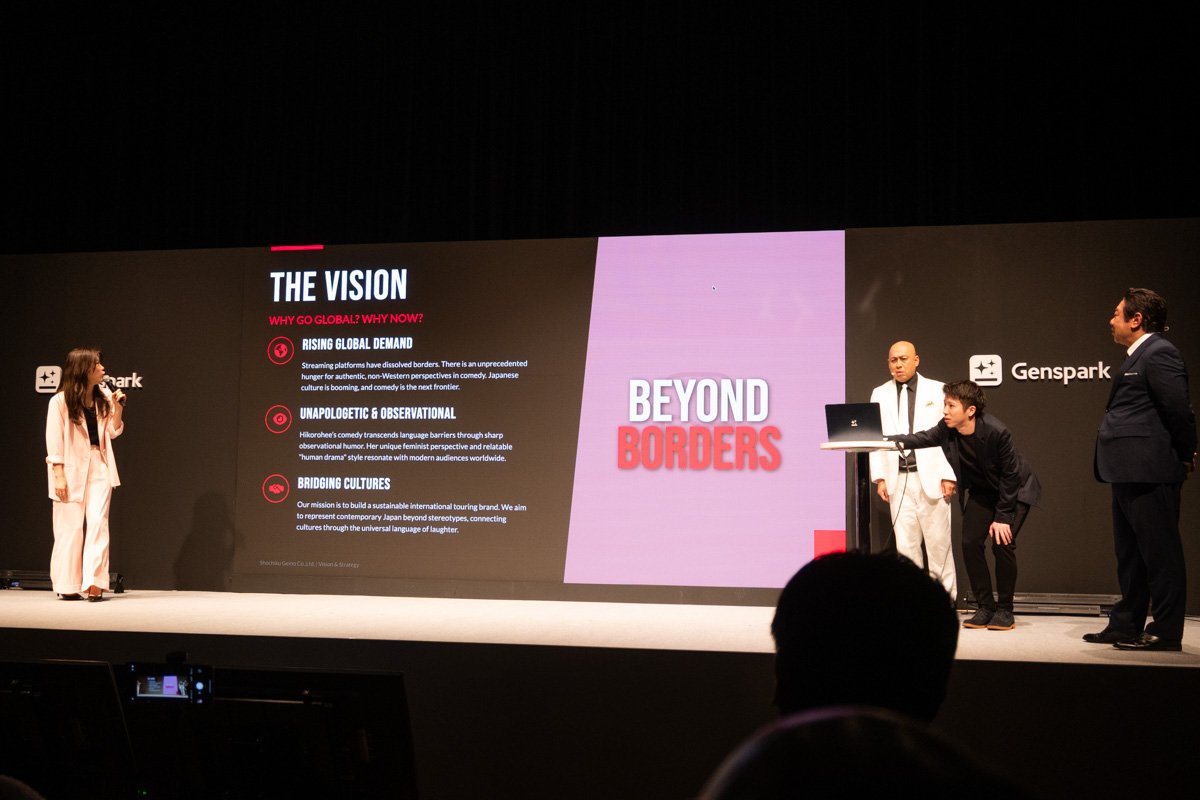 そのほか発表会では、お笑い芸人のヒコロヒーさん、そして錦鯉の長谷川さんと渡辺さんも登壇。ヒコロヒーさんのエッセイを全世界に広めていきたいというテーマにて、その戦略をまとめたプレゼン作成を実演するデモを実施した。