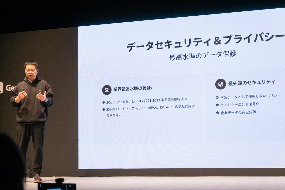 セキュリティ面では、SOC 2 Type IIおよびISO 27001:2022に準拠した認証を取得済みであり、法人利用を見据えたデータ保護を目指している。2026年には、GDPR、HIPAA、ISO 42001の認証に向けて取り組むという。
