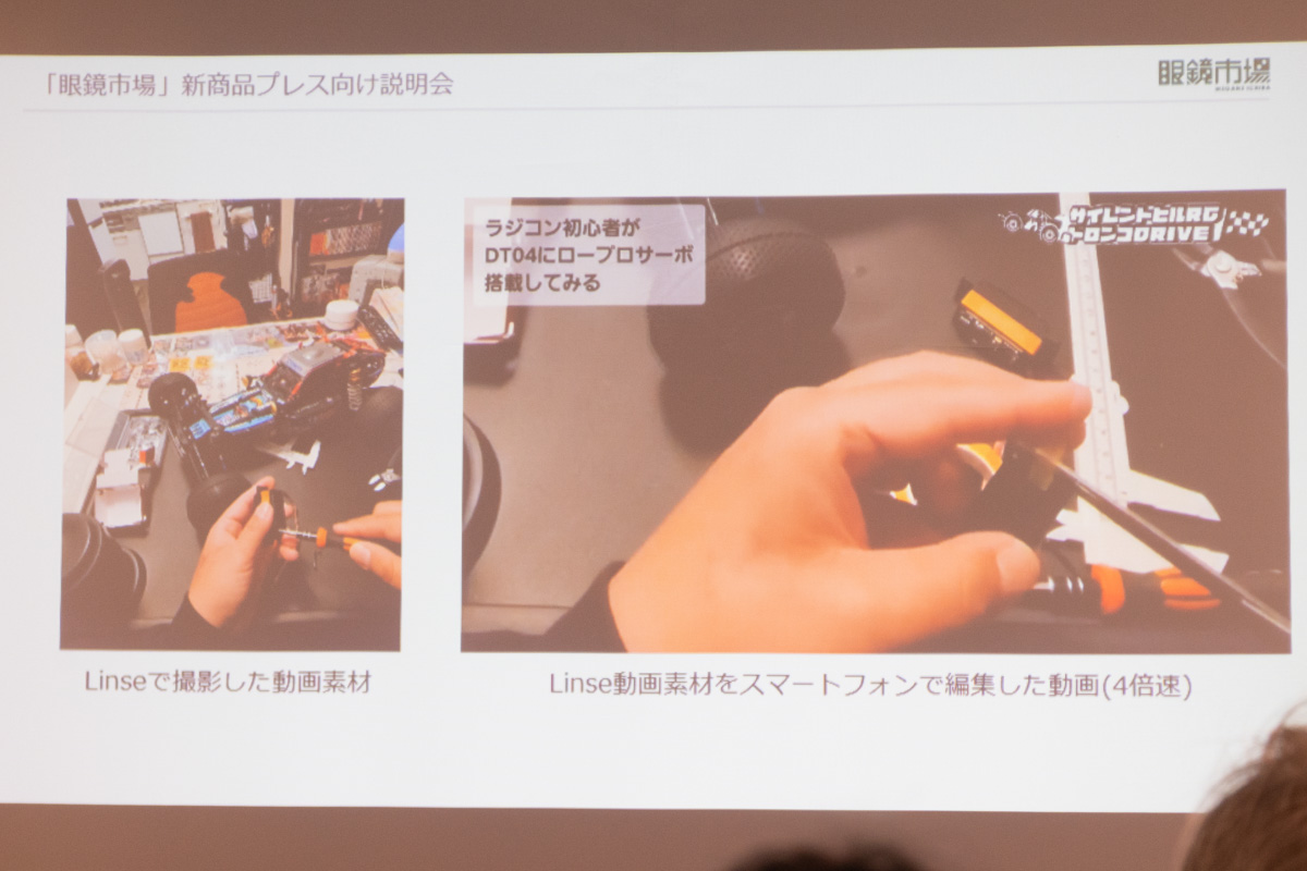 同社は目線かつ両手が塞がっていても撮れることから、ラジコンのメンテナンス風景を撮るシーンなどに活用できると説明。釣りやゴルフ、ツーリングなどにも最適だという。ビジネスにおいてマニュアル作成や教育にも有用としており、同社ではメガネを組み立てたりレンズを作るシーンを撮影したとのこと。