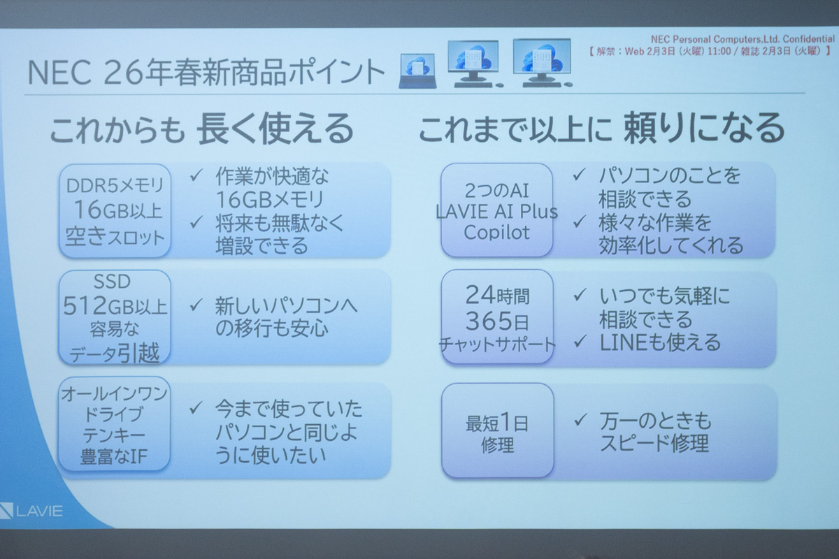 基本的な仕様は従来モデルと同様だが、内蔵メモリ(DDR5)を16GB以上、ストレージ(SSD)を512GB以上にアップグレード。メモリについては空きスロットを備えており、将来的な増設にも対応できる。