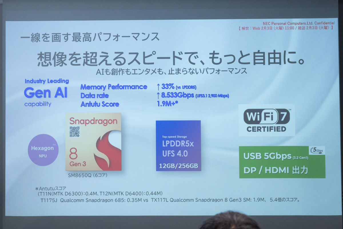 本モデルおよびT11Nのユーザー限定で、有料サブスクリプションのノートアプリ「Nedo」が無料で使い続けられる特典も付帯している。バッテリーはリチウムイオンポリマー。本体のみの質量は約530g。