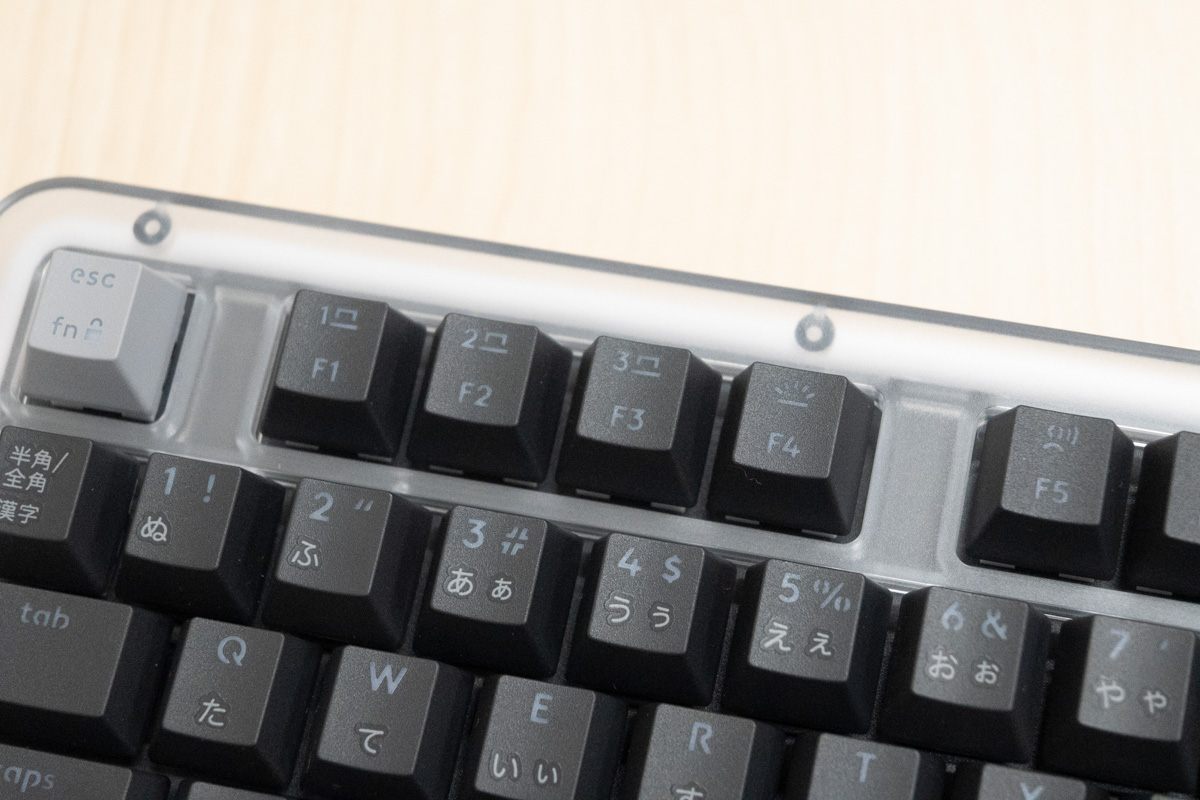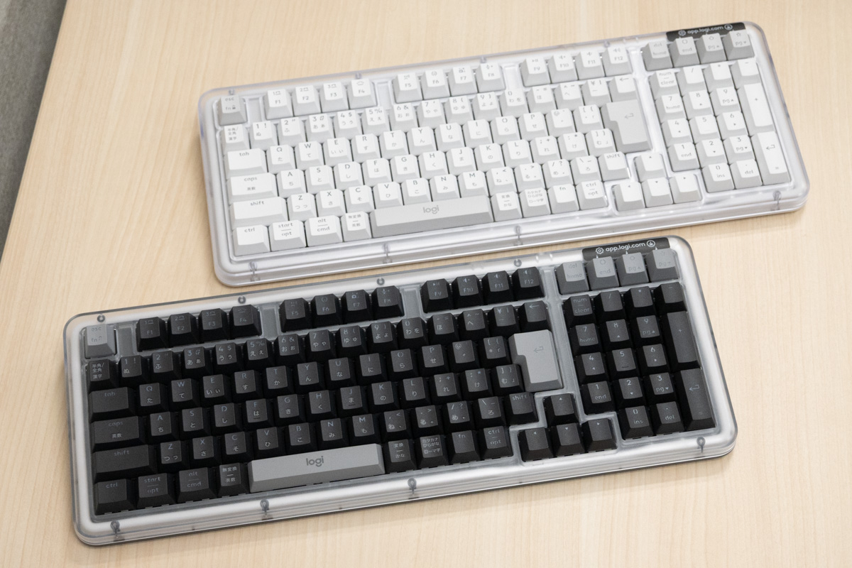 キーキャップの素材はPBTで、2色成形のダブルショット構造により、印字の摩耗にも配慮している。白色のバックライトも備えており、専用の「Logi Options+」アプリを使うことで輝度や点灯時間も調整できる。