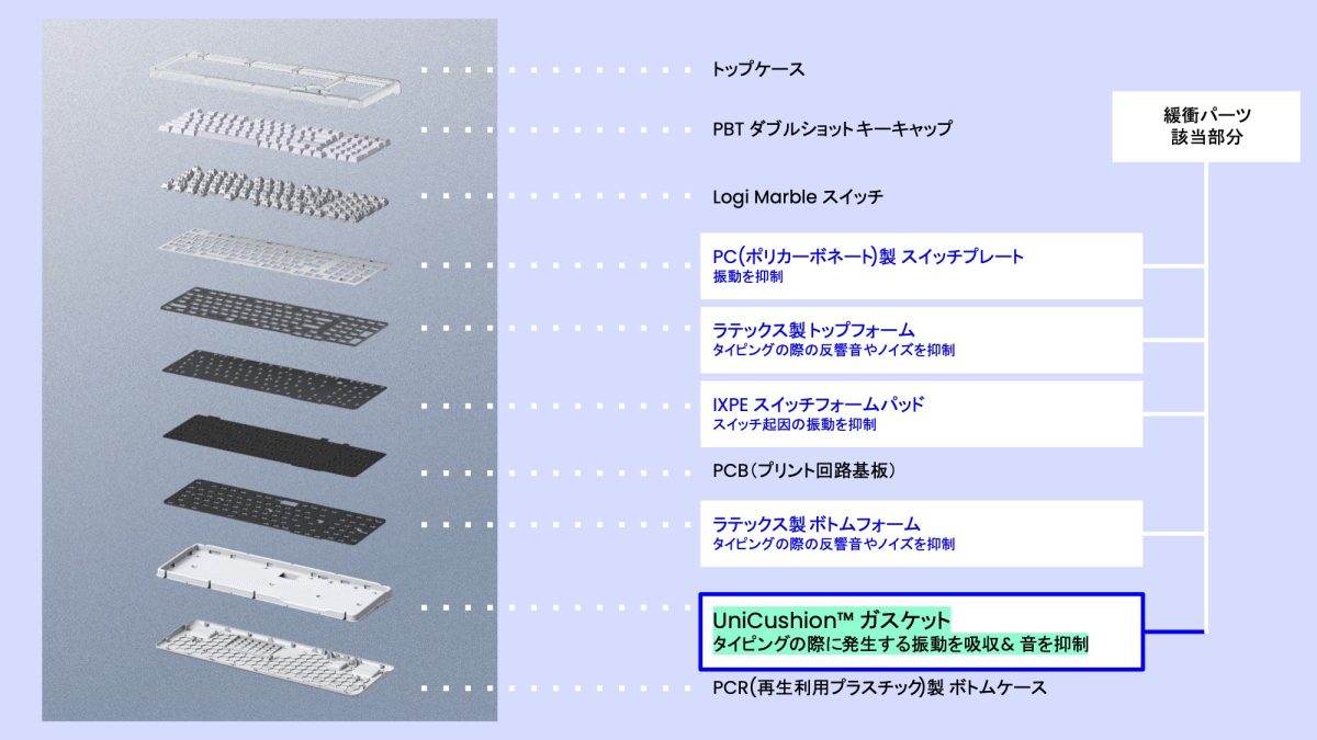 独自のガスケットマウント構造「UniCushion ガスケット」を採用することで、 “コトコト” という打鍵感を実現したキーボード。ガスケットがキーを打ち込んだ瞬間の衝撃を抑制することで、底打ちの硬さや鋭い打鍵音を軽減している。