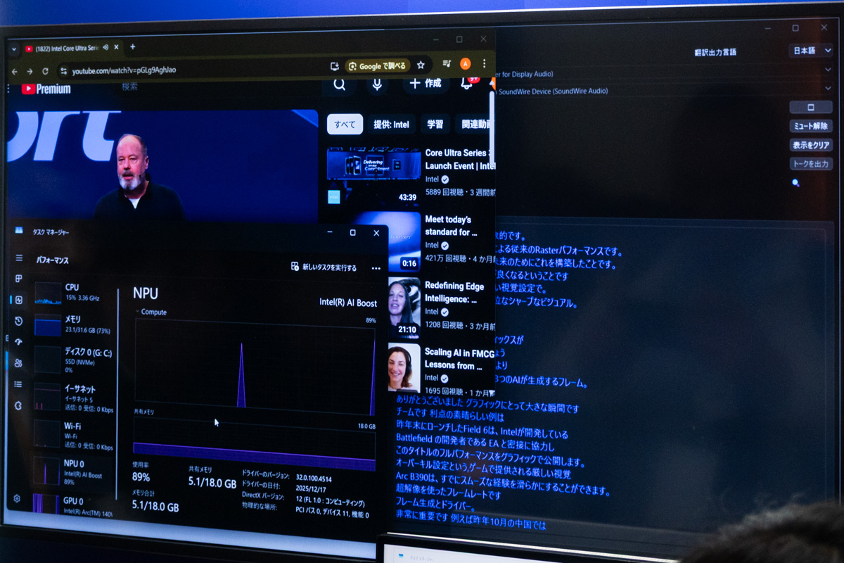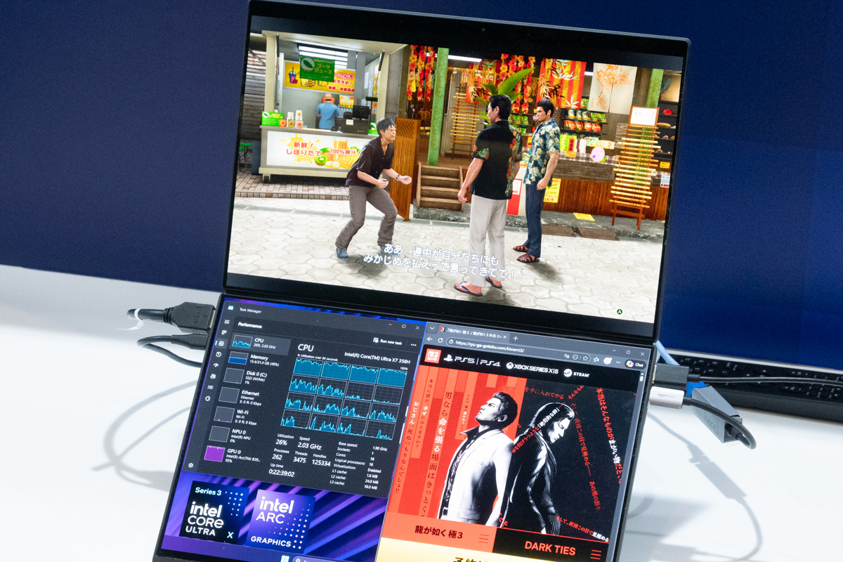 会場には展示エリアが設けられ、Panther Lakeを搭載する各種ノートPCや、AI PC向けの各種ソリューションが展示。Panther LakeにはIntel Arcグラフィックスを統合した「Core Ultra X」が投入されたこともあり、競合であるAMDのAPUとのベンチマーク比較(Cyberpunk 2077)、まもなく発売のゲーム『龍が如く 極3 / 龍が如く3外伝 Dark Ties』のデモなどが実施された。