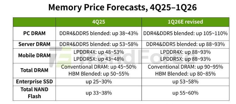台湾の調査会社TrendForceは、AIおよびデータセンター需要の継続を背景に、DRAM(メモリ)とNANDフラッシュ(ストレージ)の価格予測を大幅に上方修正した。