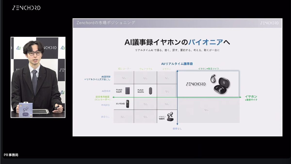 Acalie(アカリエ)は、同社が取り扱うZenchord AI(ゼンコード)のAI議事録イヤホン「Zenchord 1」の体験会をメディア向けに実施した。体験会はオンラインで行われ、実際にZenchord 1を装着しながらプレゼンを視聴した。
