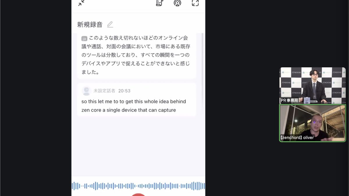 実際に記者も体験してみたが、Zenchord 1と接続したMacで再生したZoomの音声を、リアルタイムでスマートフォンに入れたNottaアプリで文字起こしできる。競合にはパソコンに別途アプリを入れ、パソコン内部の音を録音できる仕組みも用意されていたりするが、イヤホンで聴こえる音をそのまま文字起こしできるのは珍しい。