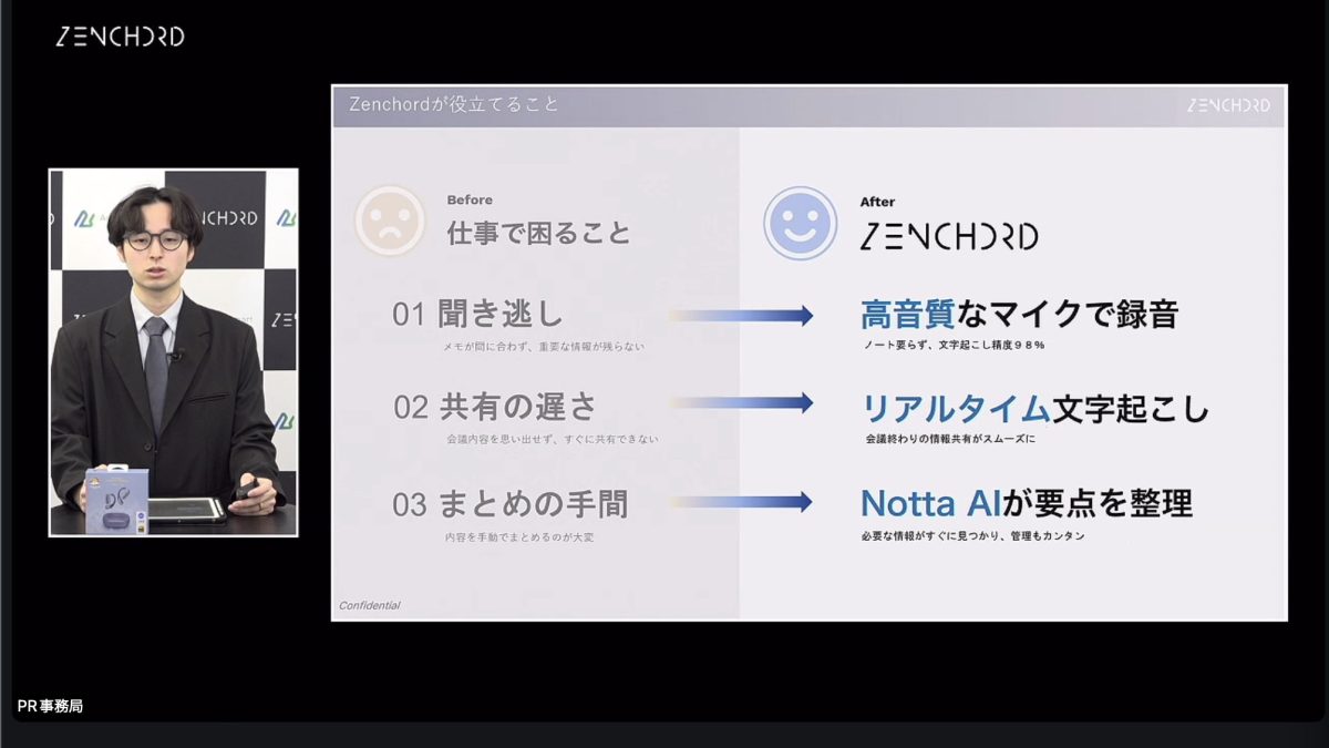 Zenchord 1を使うことで、会議やインタビューなどの録音した音声をリアルタイムで文字起こしし、要点の整理も行える。翻訳にも対応しているほか、後から会議内容を検索することも可能だ。これらは上述の通り、AI文字起こしアプリのNottaと連携することで実現している。