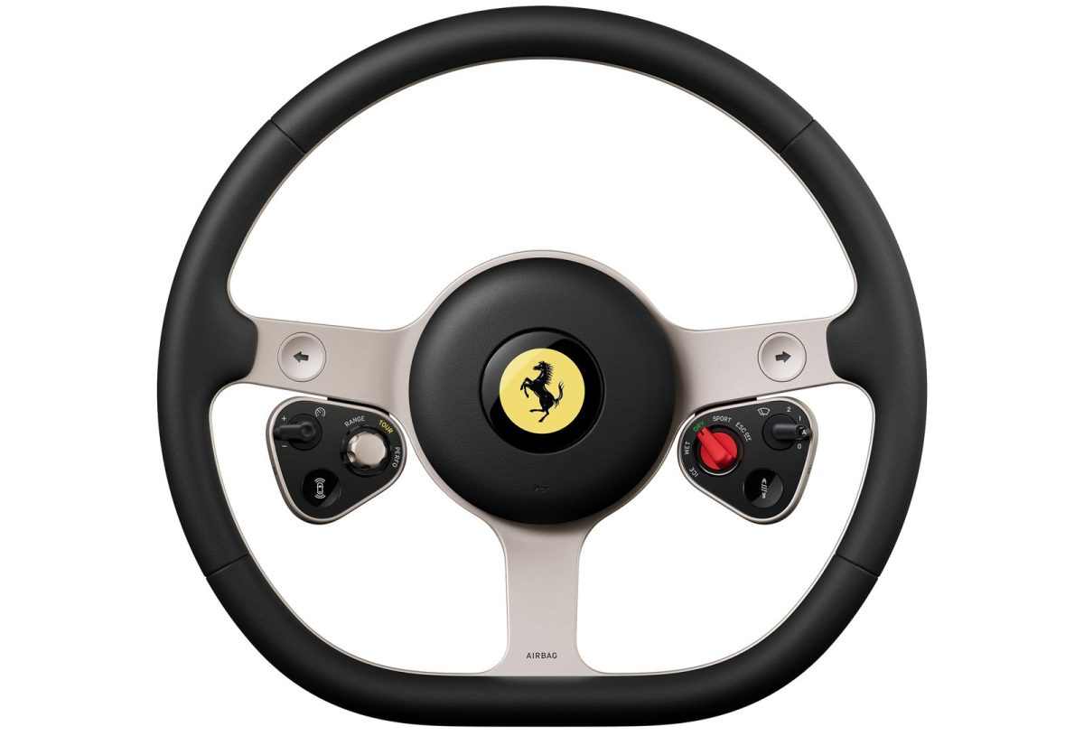 ステアリングホイールは下部分がショートカットされたD型を採用、パドルシフトや、ボタンではなくダイヤルノブを使った機能スイッチ類に、フェラーリのDNAであるモータースポーツの流儀を取り入れている。