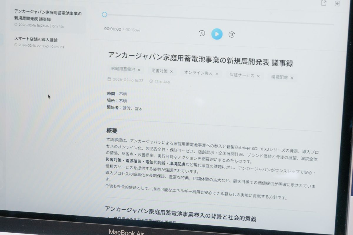 ワンクリックで録音し、文字起こしから要約までを自動化できるという製品。「議事録作成を根本から効率化」できると説明しており、録音した文字起こしデータは、議事録やインタビューやレポートなど、30以上の要約テンプレートから選ぶだけでサマリーを出力できる。