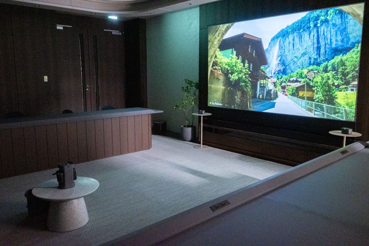 垂直方向に最大130度の角度調節ができる内蔵ジンバルを備えており、天井投影も含めた柔軟な設置に対応する。設置環境に合わせて調整する独自技術「IEA 4.0」により、垂直・水平方向の自動台形補正、オートフォーカス調整を搭載する。オートフォーカスについてはToFセンサーで補正速度も高めたとのこと。