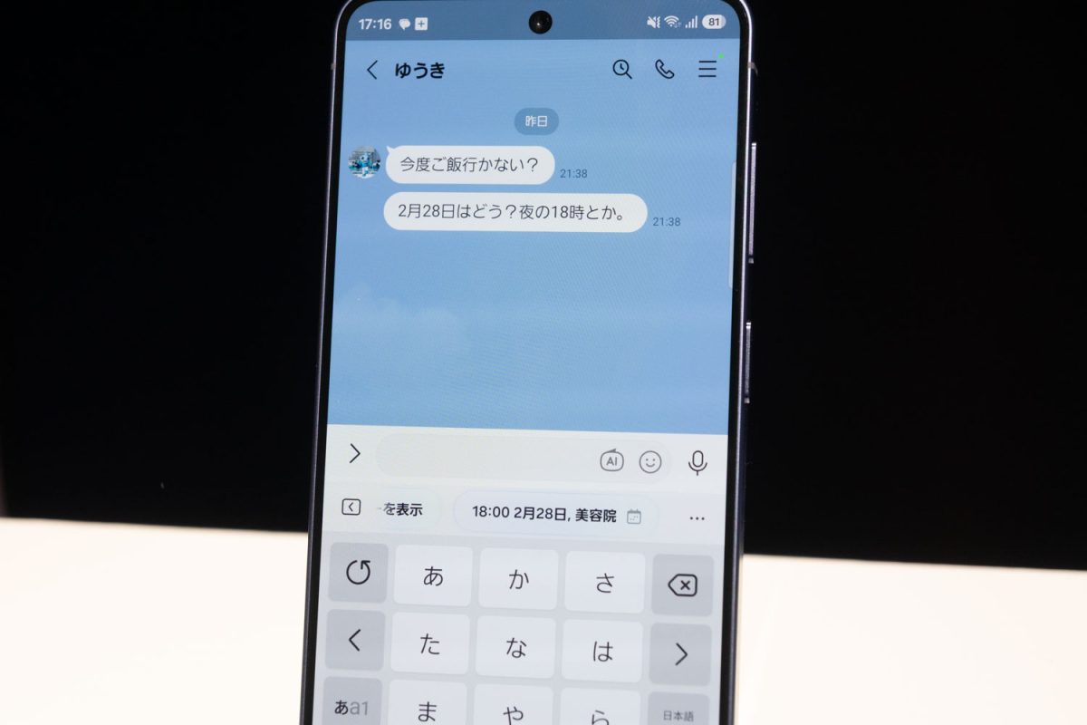 AIにおいて今回の「代表となる機能」とするのが、文脈を理解して即座に提案する「Now Nudge」というもの。LINEなどのメッセージアプリ等におけるやり取りで利用でき、画面上のテキストの情報を読み取り、ふさわしい情報を表示できる。予定が入っていればカレンダーの情報を表示することが可能。「あの時のこういう写真を送って」というやりとりがあれば、ギャラリーアプリに該当しそうな写真を集め、タップするだけでシェアすることもできる。