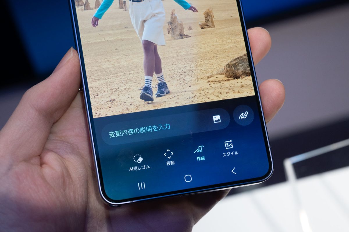 AI編集機能では、Galaxy AIと一体化することで高度なクリエイティブ作業を実現するとアピール。ギャラリーアプリには、プロンプトで思い通りに生成できる「フォトアシスト」を搭載。これまでのように指などで場所を指定せず、プロンプトベースで編集が行えるようになった。たとえば「夜に変えて」という指示も可能。さらに「編集を続行」することで、追加で服を変えることもできる。