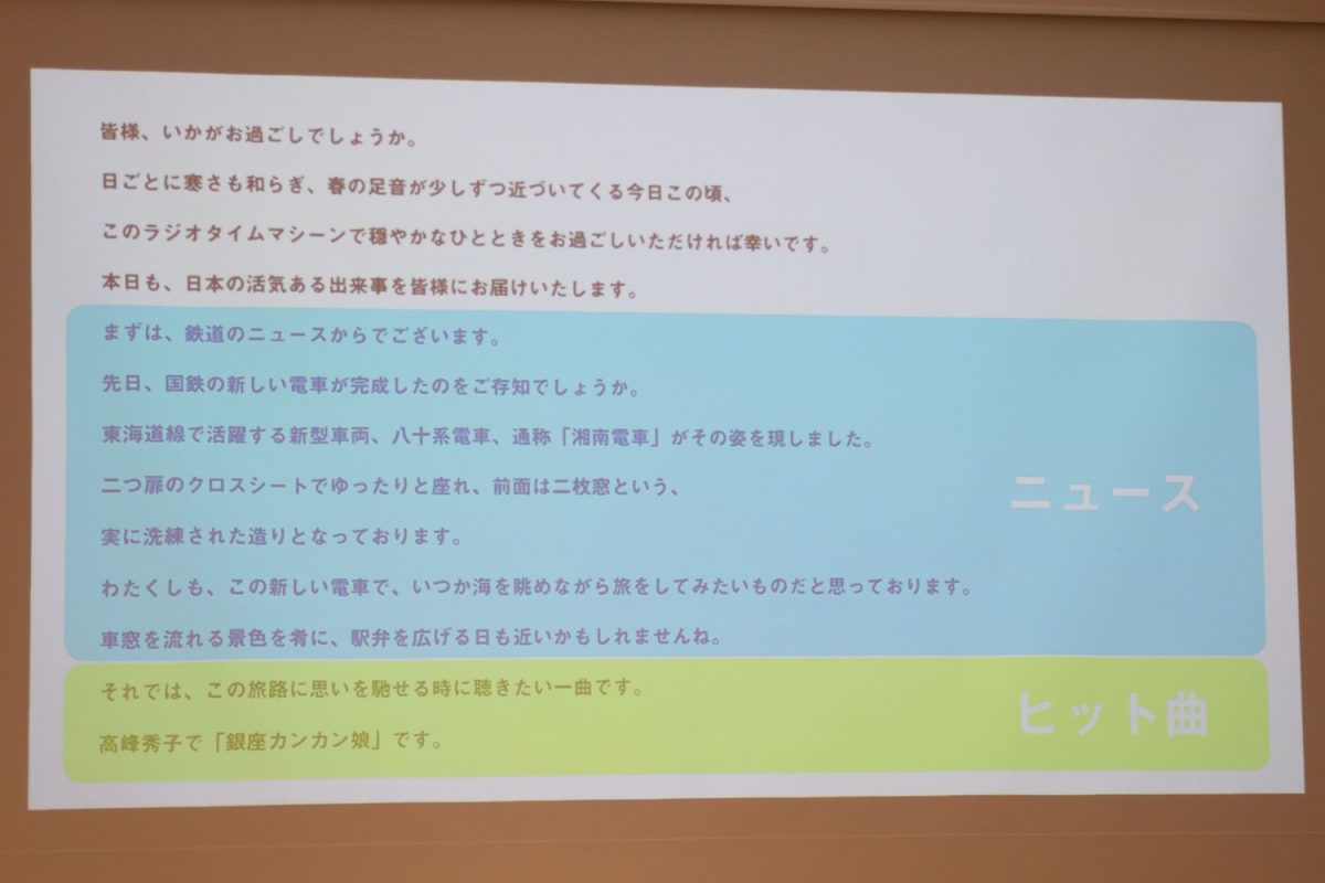 AIボイスについては、30名以上の声を収録したものをもとに生成する。当時のラジオ番組を思わせるような懐かしく自然な語り口を再現するため、過去のラジオ番組にみられる話し方、抑揚、テンポから規則性を構築し、時代感を反映しつつ音声として都度生成するという。