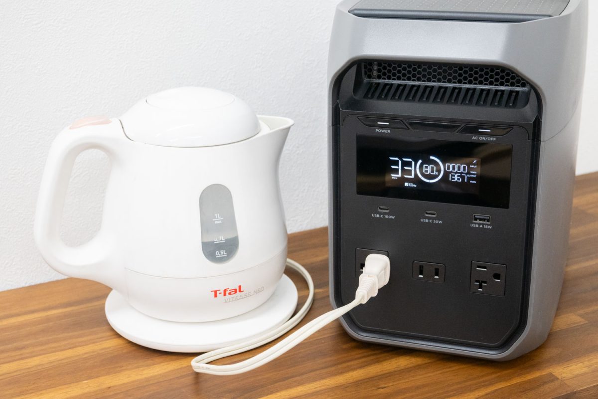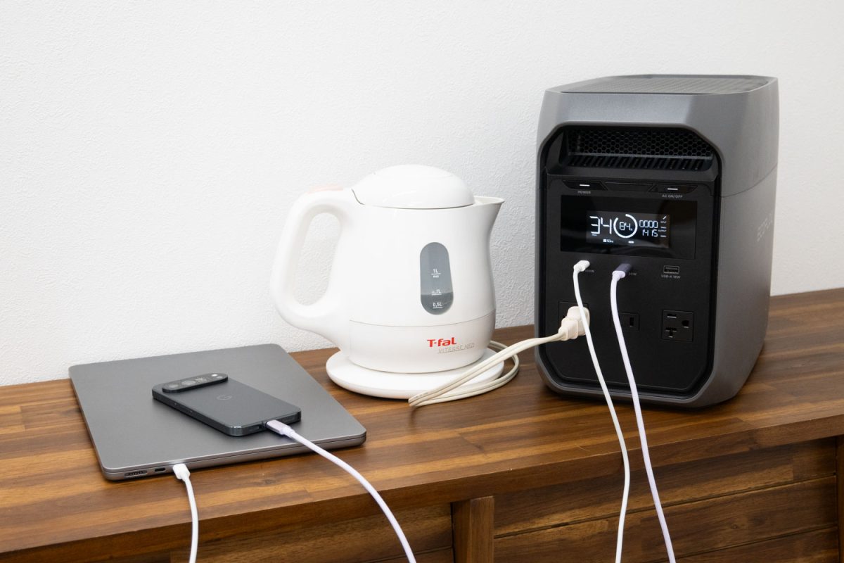 DELTA 3 Classicに、電気ケトル、ノートPC、スマートフォンを接続して使用してみた。電気ケトルに700mlの水を入れて沸かしたところ、1500W近い電力を消費しながらも問題なく沸騰させられた。沸騰までに減ったバッテリー残量はわずか10%。1000Whクラスの容量があれば、お湯を沸かすようなパワフルな使い方をしても十分な余裕がある。