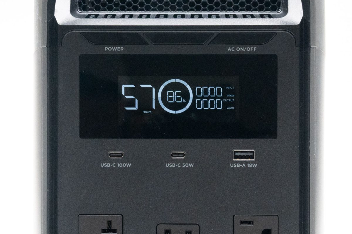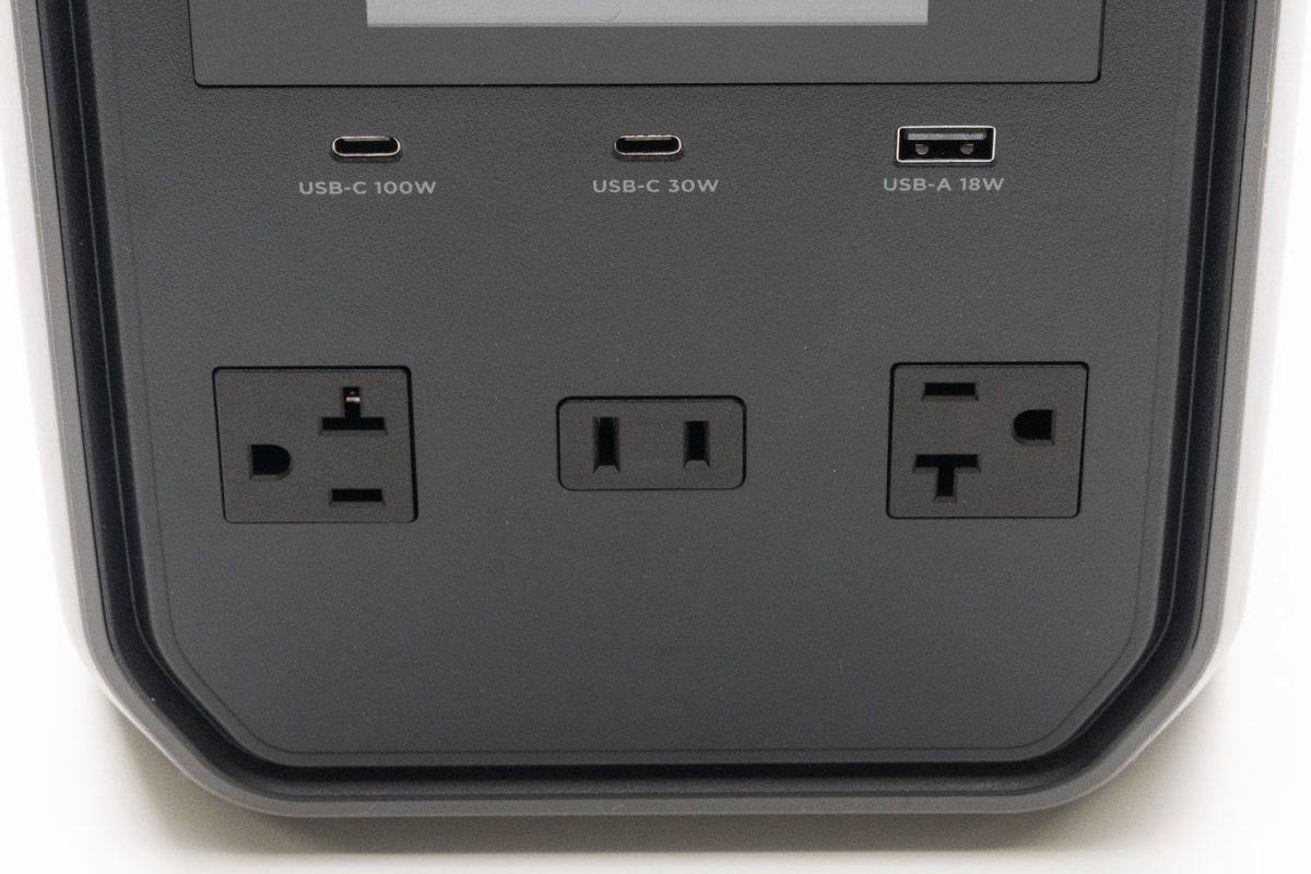 ポート類は厳選されていて、ACコンセントが3口、USB-Aが1口、USB-Cが2口(最大100Wと30W)に厳選されている。上位のDELTA 3 Plusよりは少ないが、本機でもスマートフォン3台とAC機器3つを同時に使えるため、実際の使用シーンで困ることは少ないと思う。