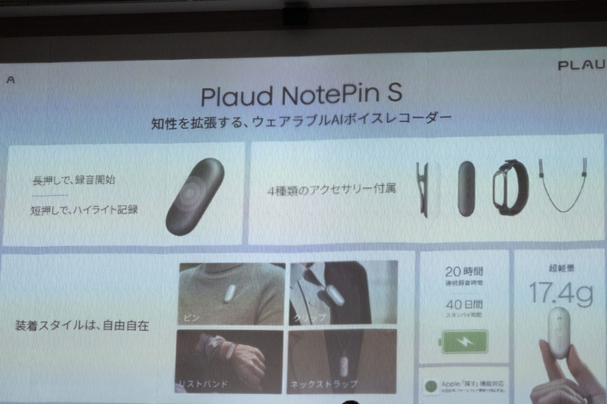 本モデルの登場により、今回のPlaud NotePin Sのほか、カード型の最上位モデル「Plaud Note Pro」、同じくカード型の初代モデル「Plaud Note」というラインナップ構成となった。